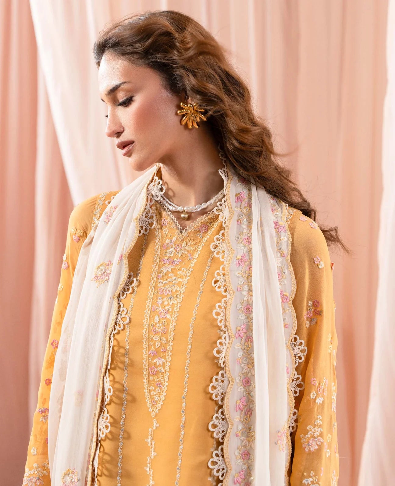 A mustard chiffon ensemble featuring a knee length chiffon shirt, delicately embroidered in soft hues of white and yellow with a subtle hint of pink, adding an elevated and refined charm. Paired with capri length raw silk trousers, finished with intricate embroidery along the hem. Completed with a white chiffon dupatta accented with gentle pops of color, creating an elegant and beautifully balanced contrast.