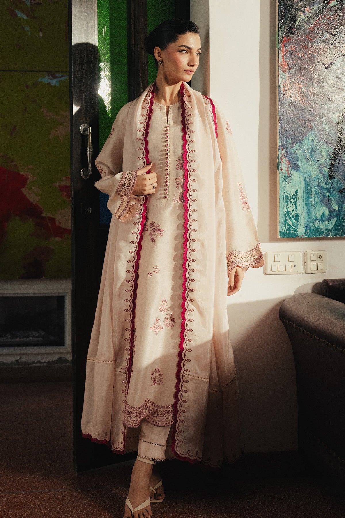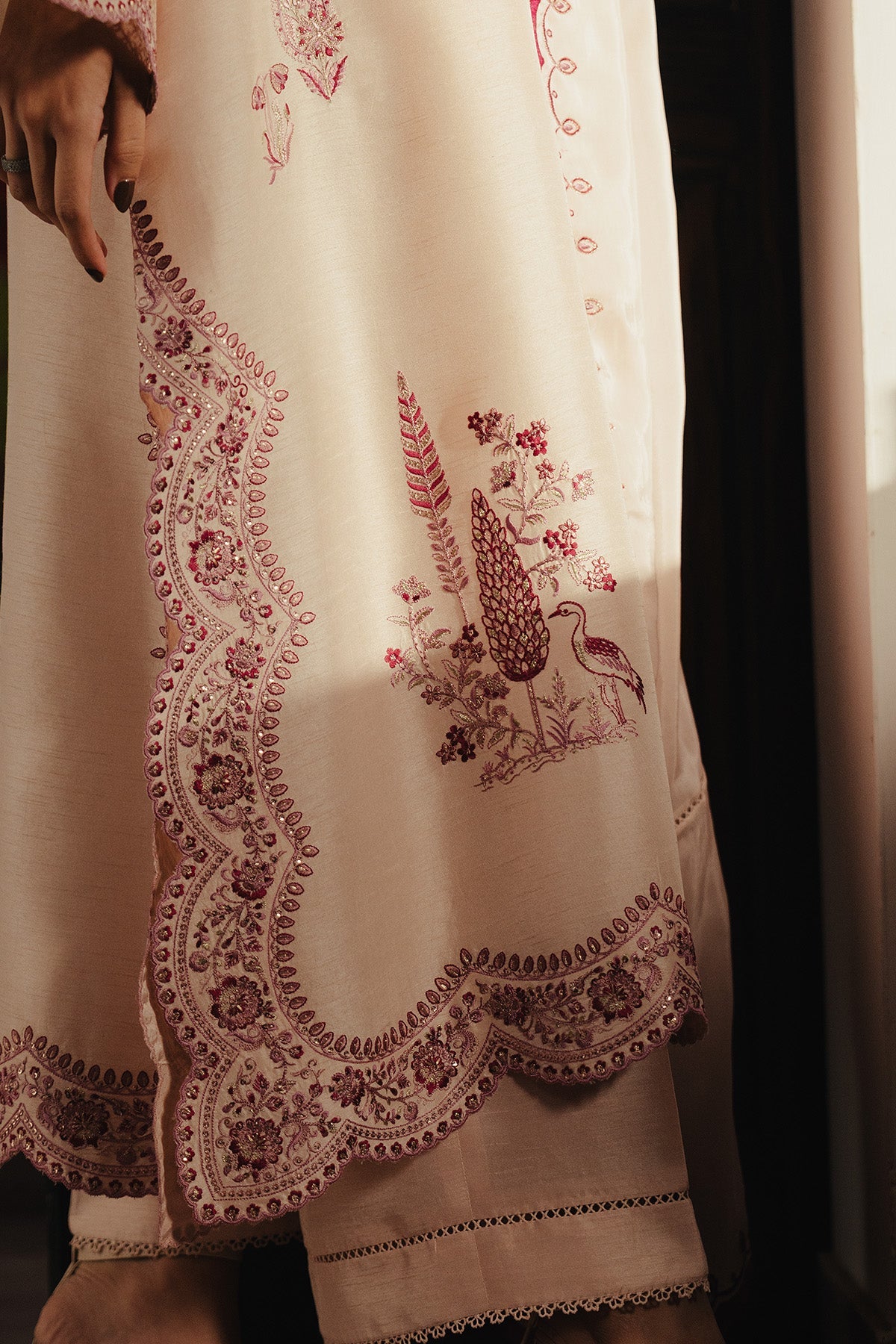 This ivory set features an embroidered shirt with delicate cutwork detailing along the hem and sleeves, paired with straight pants and an embroidered silk dupatta.