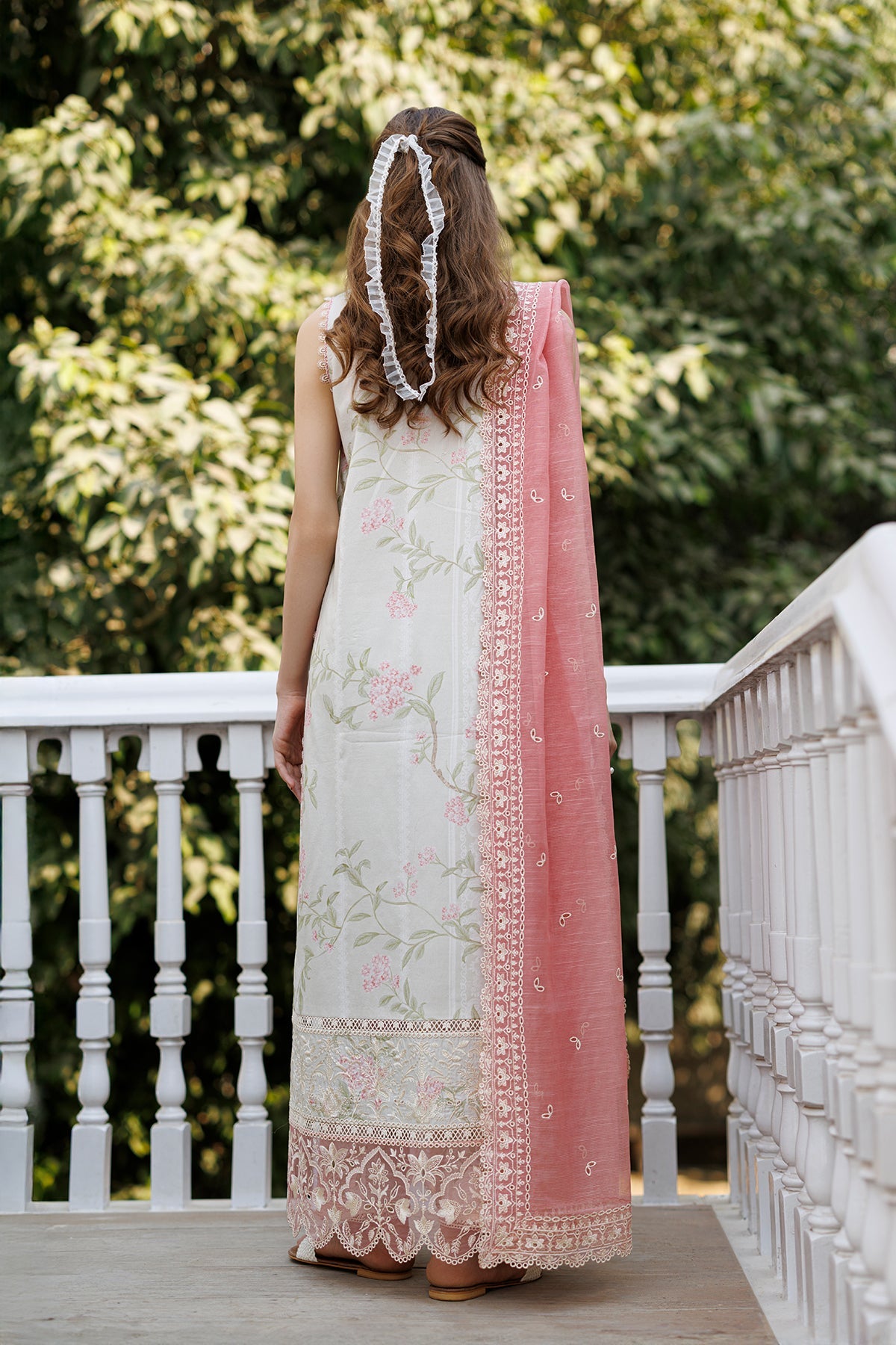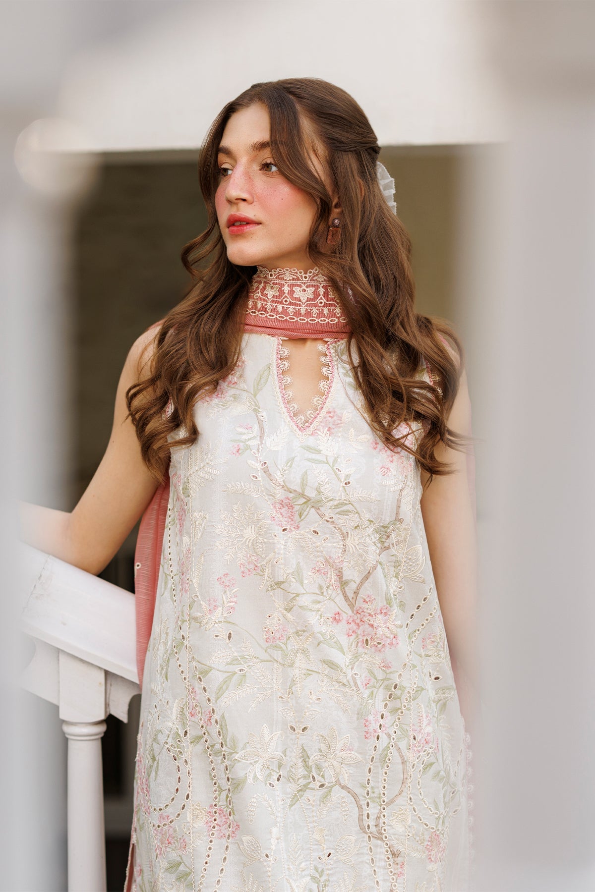 An ivory ensemble brought to life with delicate floral embroidery in subtle pastel tones, creating a light and graceful surface texture. The sleeveless long shirt falls effortlessly, its intricate detailing balanced by a clean, fluid silhouette. A sheer blush-toned dupatta, edged with fine lacework, adds a gentle contrast and a touch of romance to the look. The ensemble feels airy and refined — understated, feminine, and perfect for sunlit days where elegance is expressed through softness and detail.