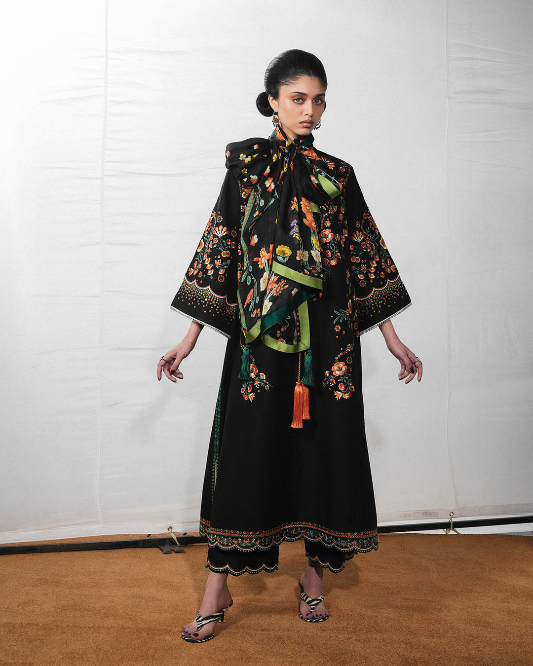 A long black shirt adorned with multicolor floral embroidery and subtle sequins is complemented by matching bell sleeves for a refined, graceful silhouette. It is styled with black dyed culottes featuring an embroidered border, while a digital printed silk dupatta adds a contemporary and elegant finish.