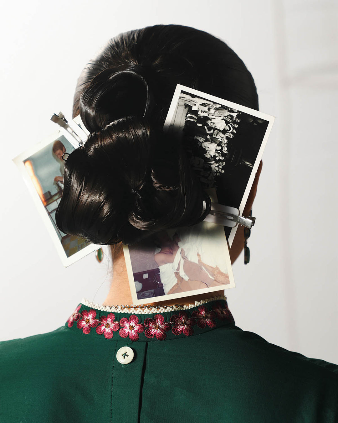 A long green shirt adorned with multicolor floral embroidery is elegantly complemented by bell sleeves featuring matching embroidered borders, creating a refined and graceful silhouette. The ensemble is paired with green dyed harem pants that offer fluidity and comfort, while a multicolor floral-embroidered chiffon dupatta adds a delicate, sophisticated finishing touch.