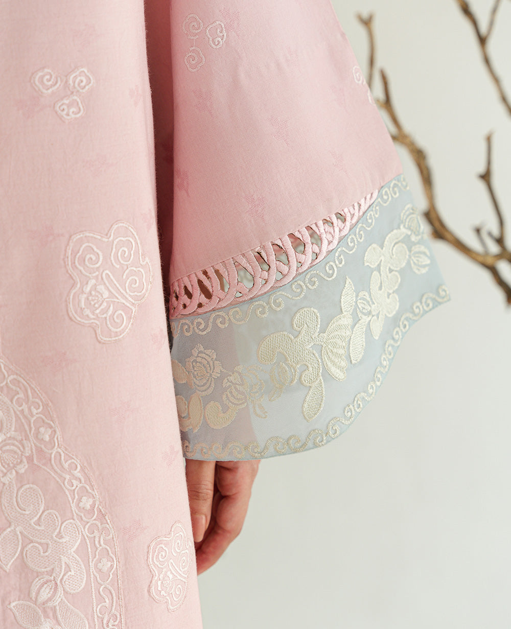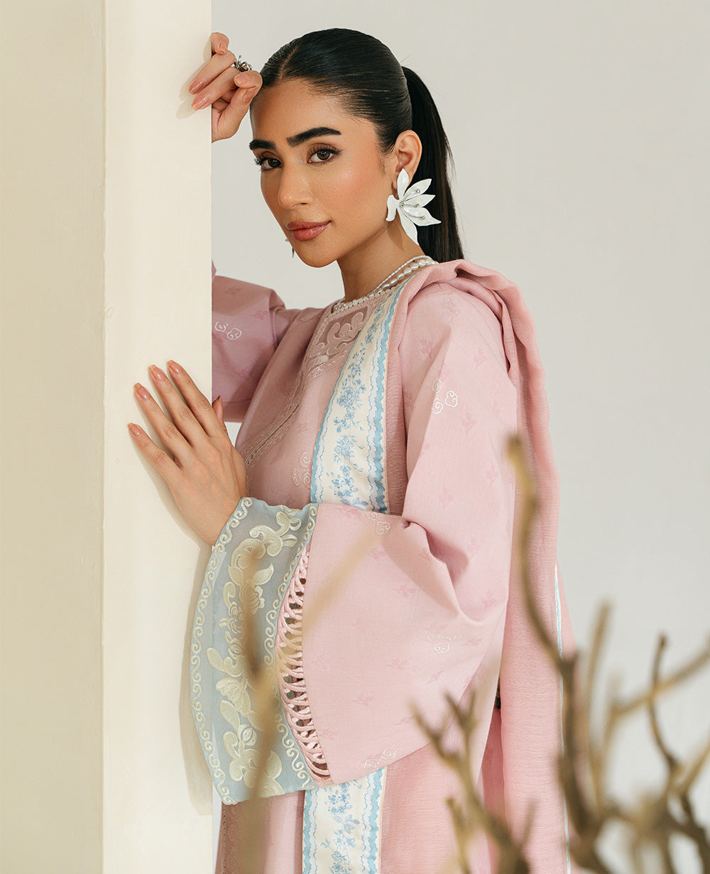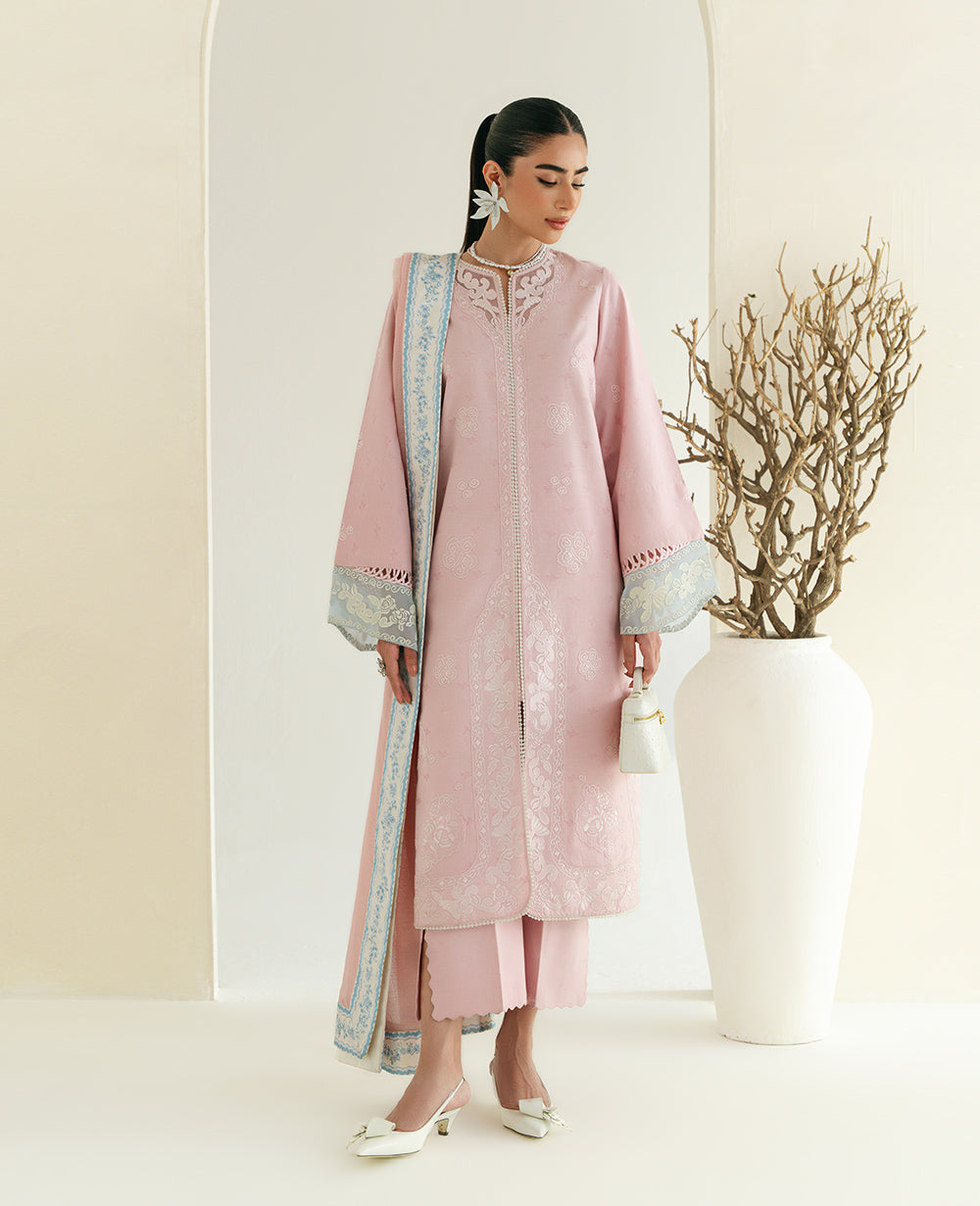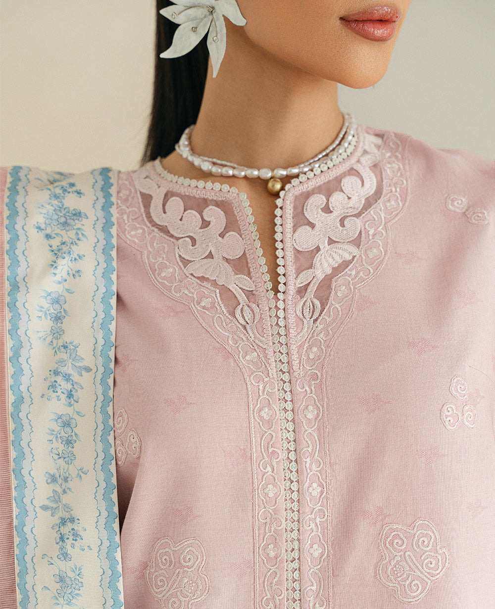 This long-length front-open shirt in soft pink is a beautiful combination of elegance and intricate craftsmanship. The shirt features delicate tatami embroidery in hints of white and ivory, creating a refined and timeless look. The shirt is enhanced with a contrasted powder blue border, adding a soft pop of color. The tatami embroidery continues on the sleeves, finished with a pink loop-detailed border, adding a touch of artisanal detail. Paired with a luxurious net dupatta, the ensemble is elevated with a contrasting white base featuring a blue print, perfectly complemented by a silk dupatta border that ties the soft pink tones together with a sophisticated finish.