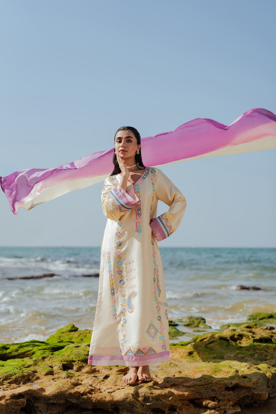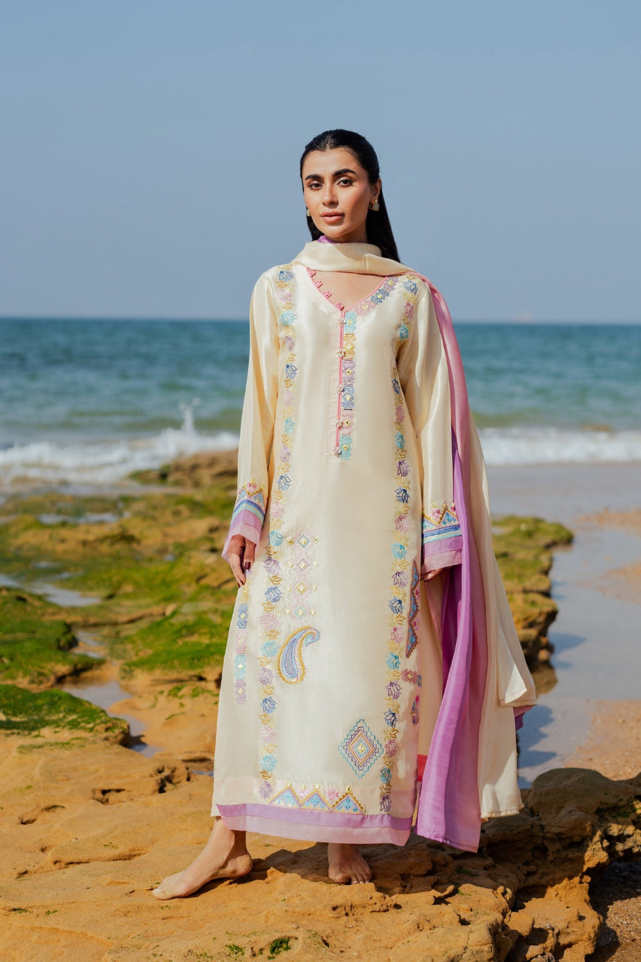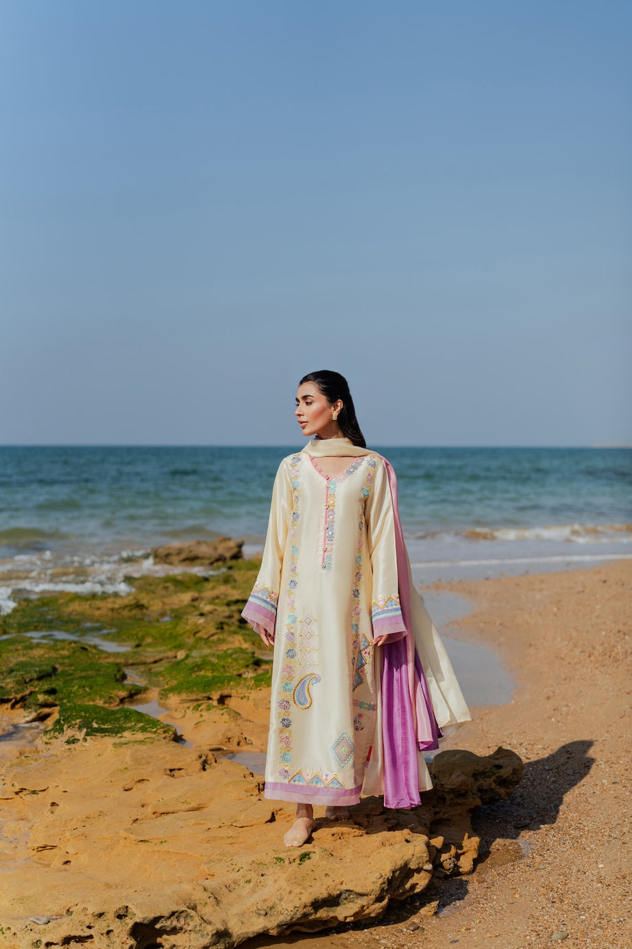 Embrace timeless sophistication this Eid with our latte beige 2-piece ensemble, featuring a delicately hand aari embroidered shirt. The subtle embroidery adds depth and elegance to the soft, neutral tone. Paired with tailored tapered pants, the outfit offers a clean and graceful silhouette. Complete the look with an optional embroidered chiffon dupatta for an effortlessly refined Eid statement.
