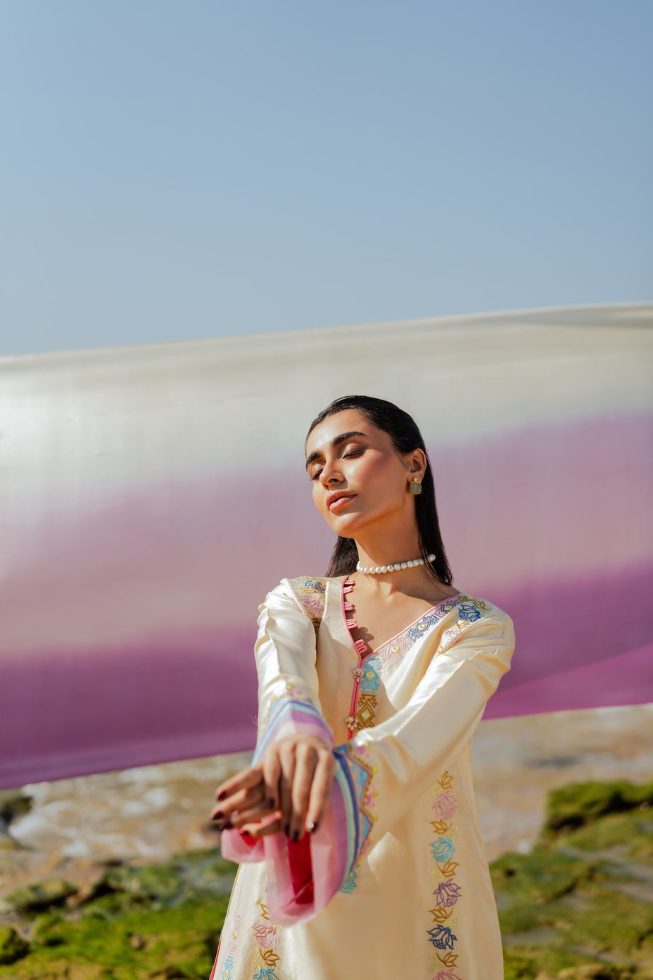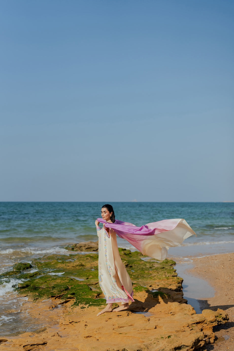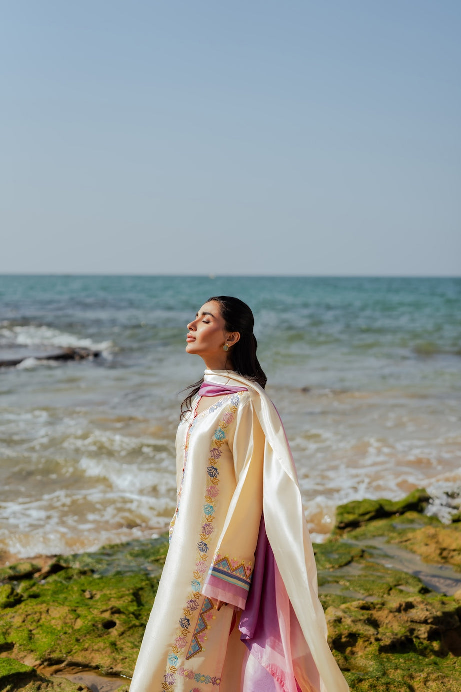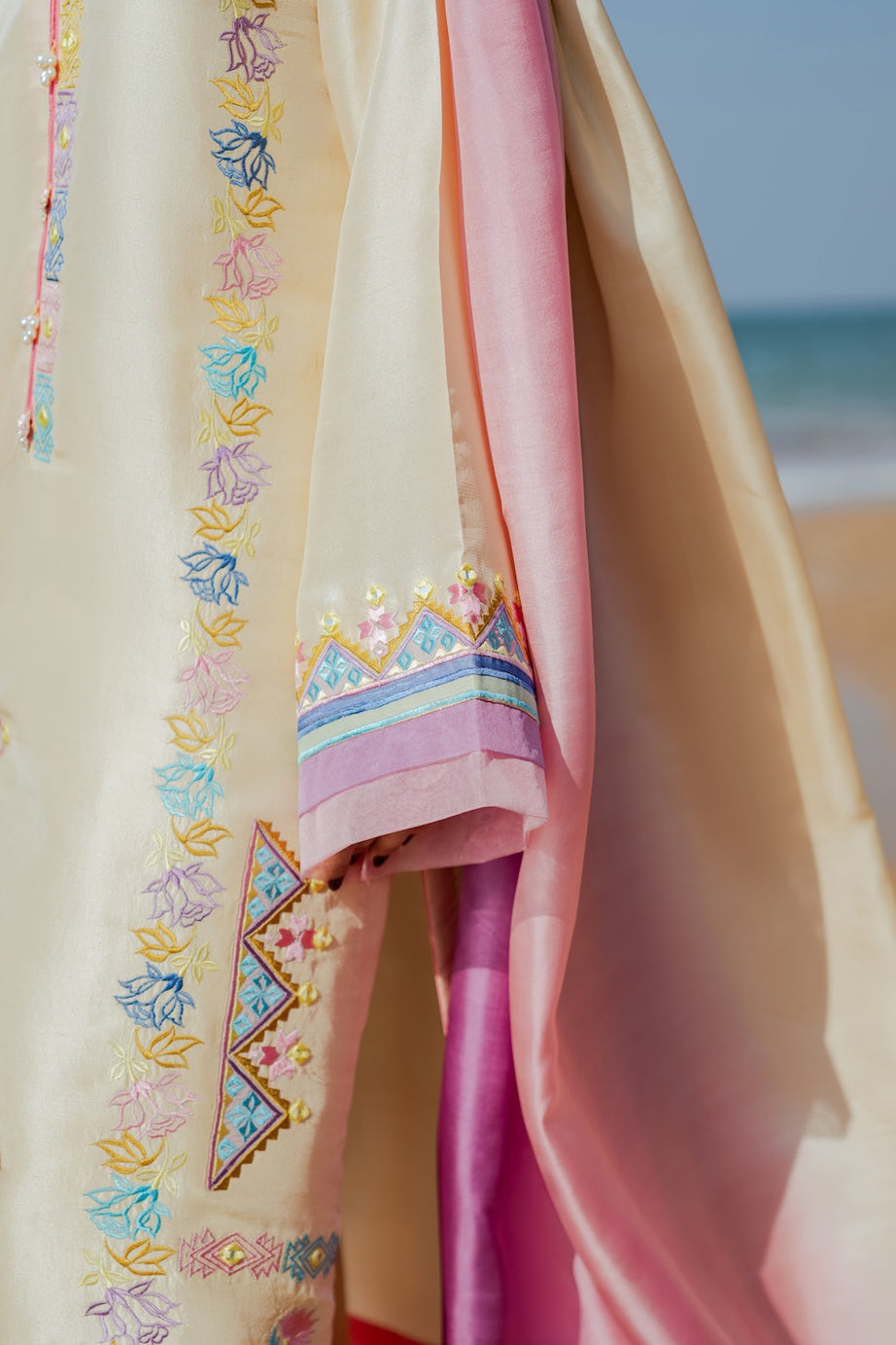Embrace timeless sophistication this Eid with our latte beige 2-piece ensemble, featuring a delicately hand aari embroidered shirt. The subtle embroidery adds depth and elegance to the soft, neutral tone. Paired with tailored tapered pants, the outfit offers a clean and graceful silhouette. Complete the look with an optional embroidered chiffon dupatta for an effortlessly refined Eid statement.