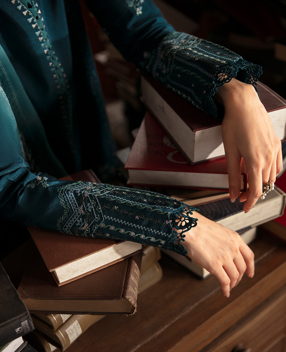 Presented in a captivating shade of haute red, this ensemble showcases exquisite embroideries in soft, subtle variations, meticulously crafted with fine threadwork and enhanced with shimmering silver accents. The graceful open-front design, adorned with whimsical floral motifs that gently flow across the chiffon fabric, exudes a refined femininity, elevating the outfit with elegance in every detail. Paired with intricately detailed trousers and a matching scalloped chiffon dupatta, this look radiates an enduring charm that transcends time.