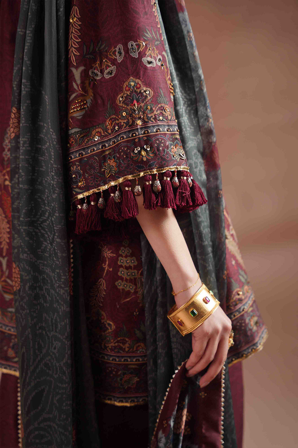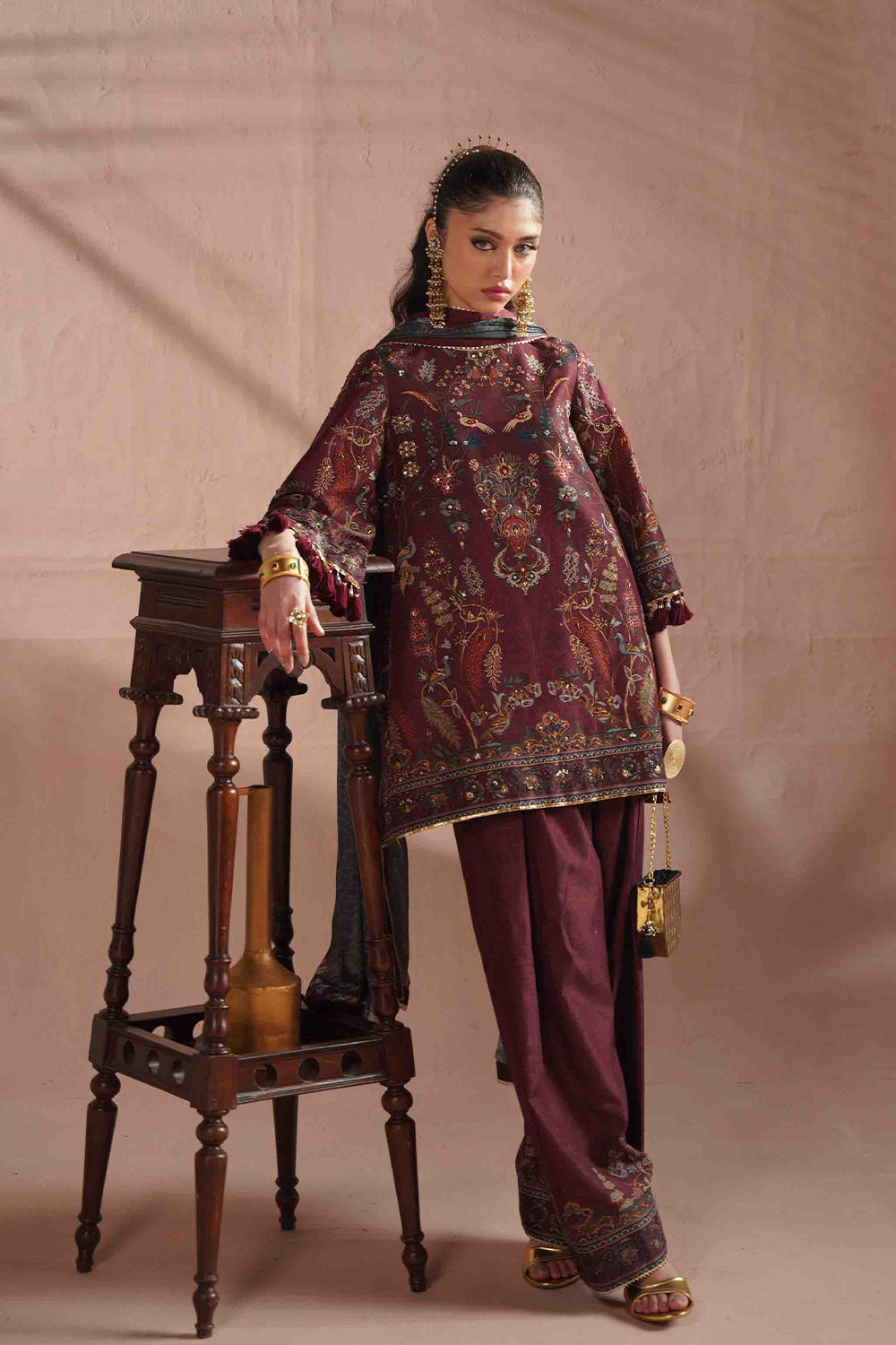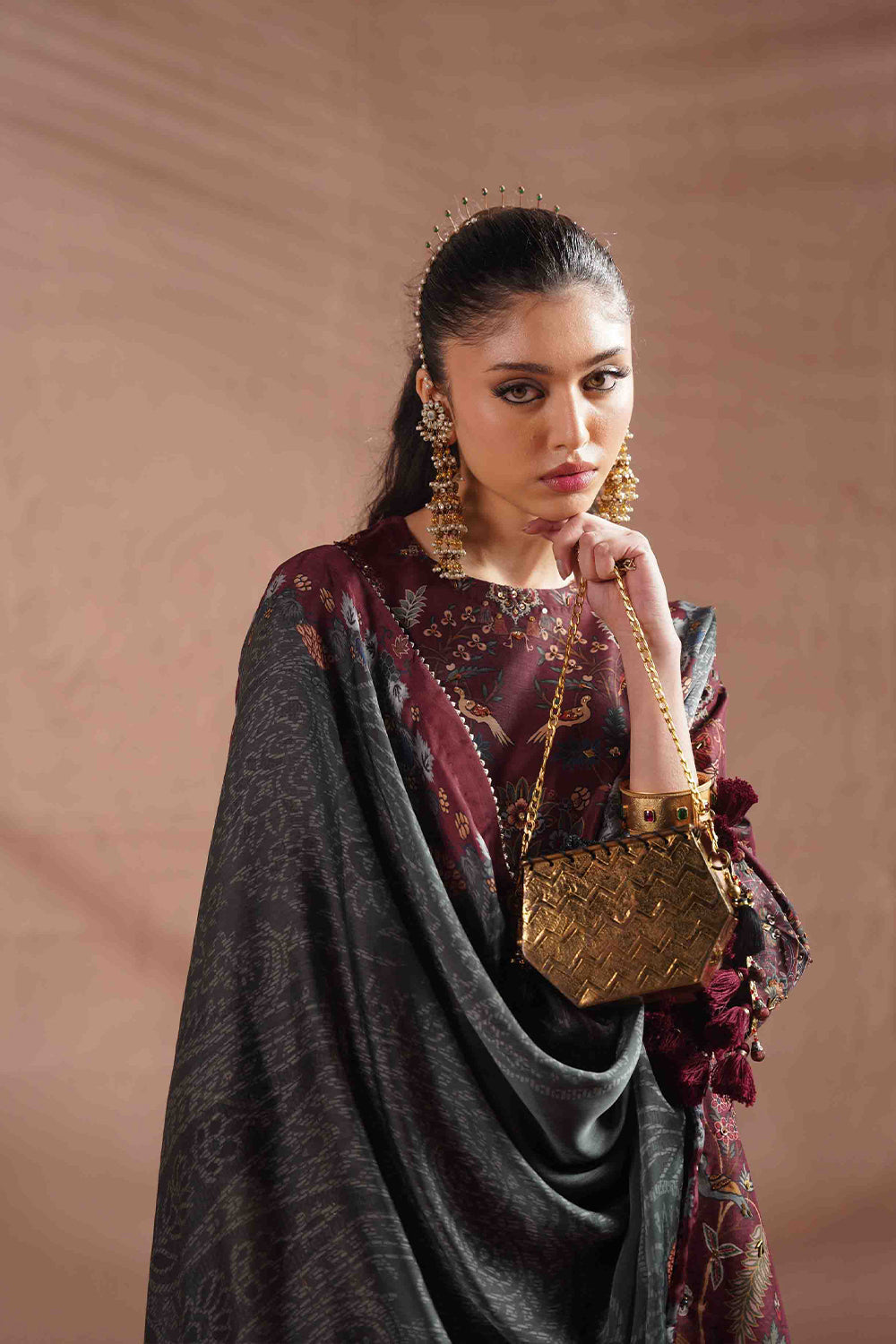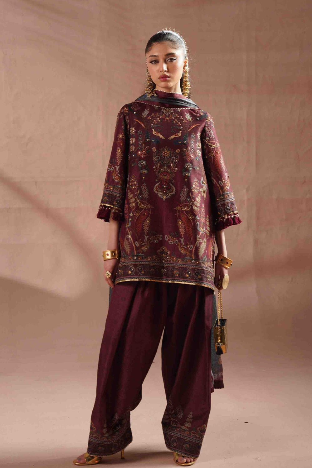 DESCRIPTION: This elegant ensemble is tailored from luxurious silk fabric, beautifully enhanced with embroidery and intricate resham detailing. A matching printed silk dupatta completes the look with effortless sophistication and grace.