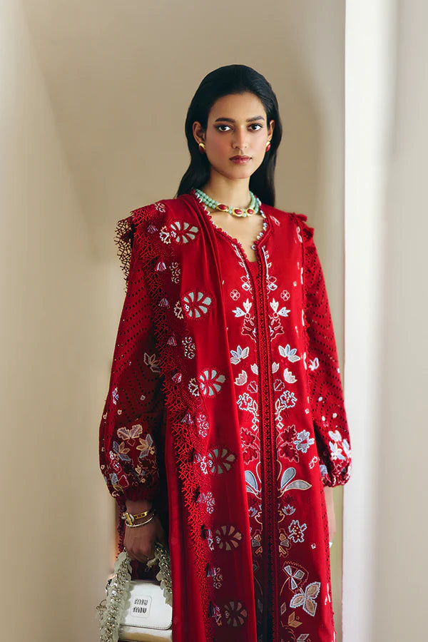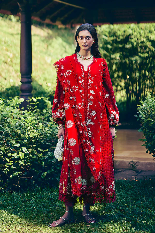 - Coral Red, front-open cotton shirt featuring a square V-neckline. It is adorned with contrasting floral appliqué in organza in various shades. The shirt has lace and stitching details on the hem, and the sleeves are designed as balloon sleeves. A jaal pattern complements the side panels and sleeves, creating a cohesive look. It comes with a slip.