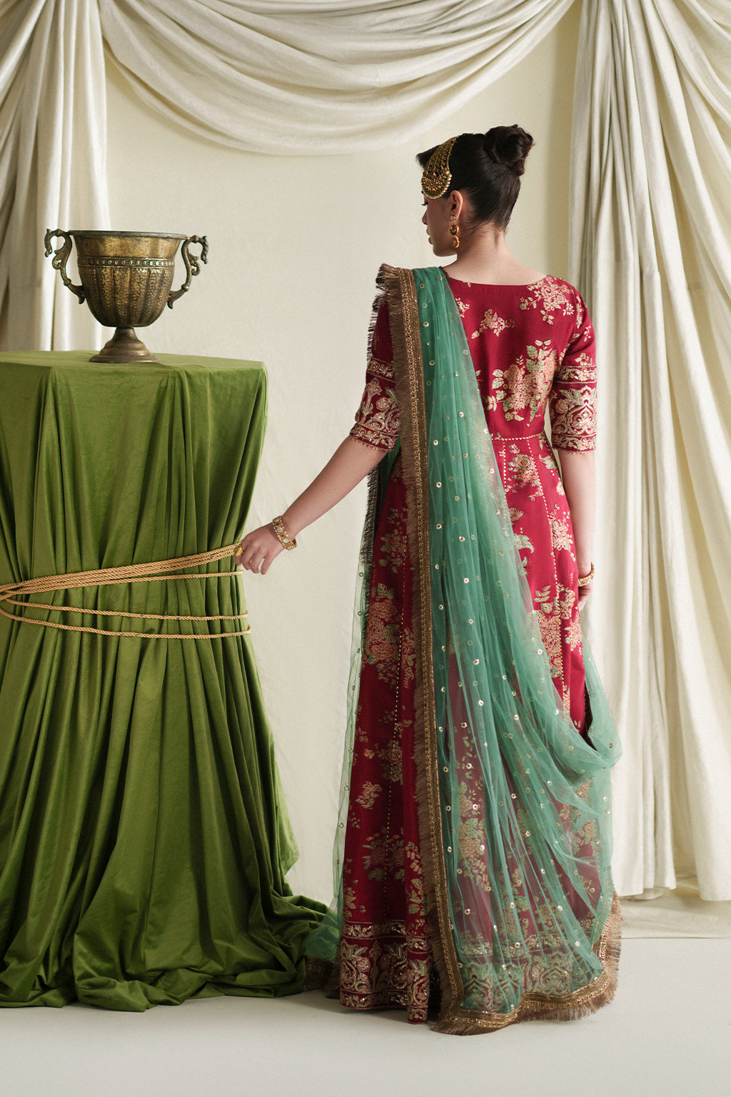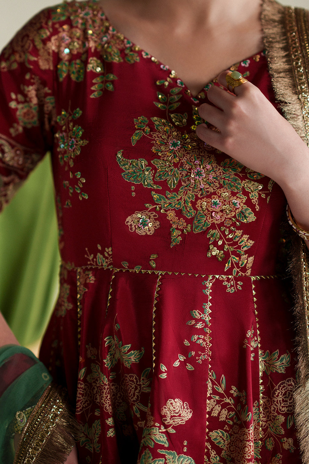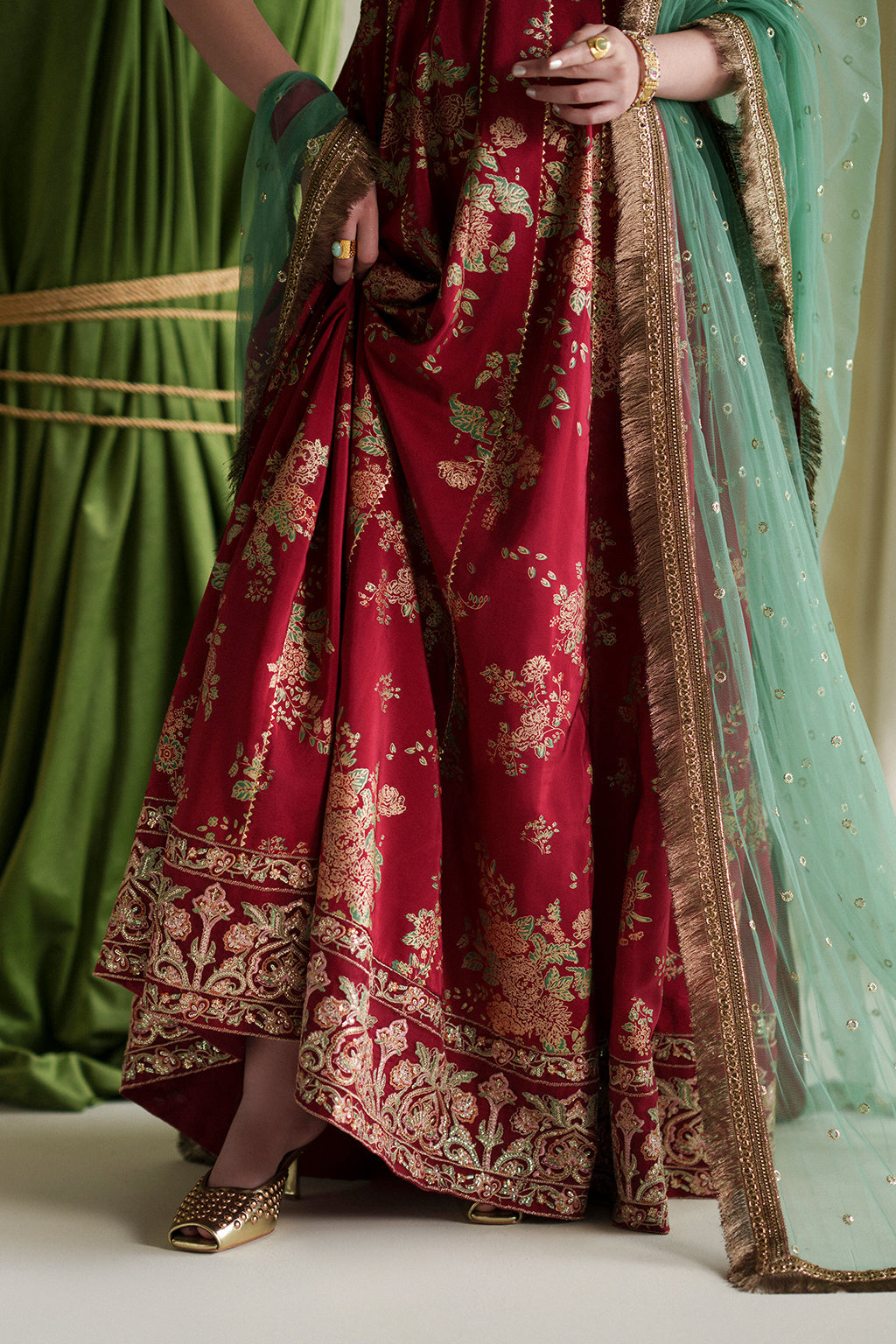 A graceful coral angrakha adorned with intricate embroidery and hand embellishments, paired with screen-printed crushed pants and a contrasting net dupatta for an elegant festive look.