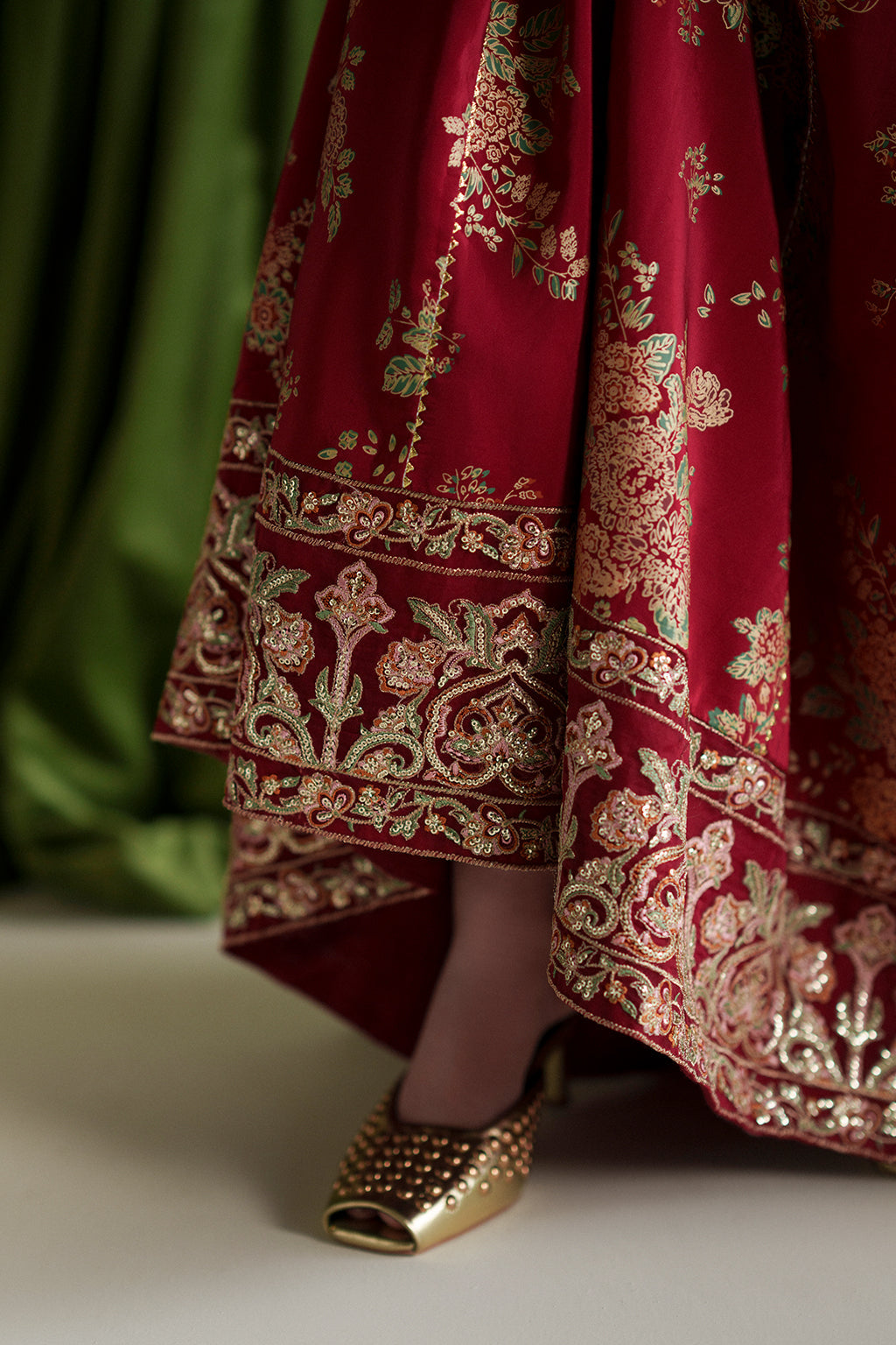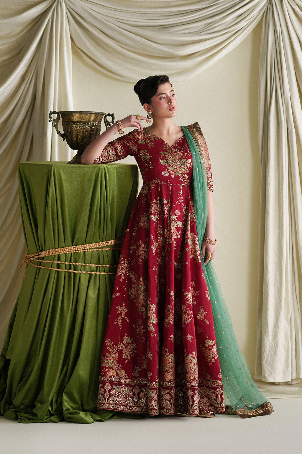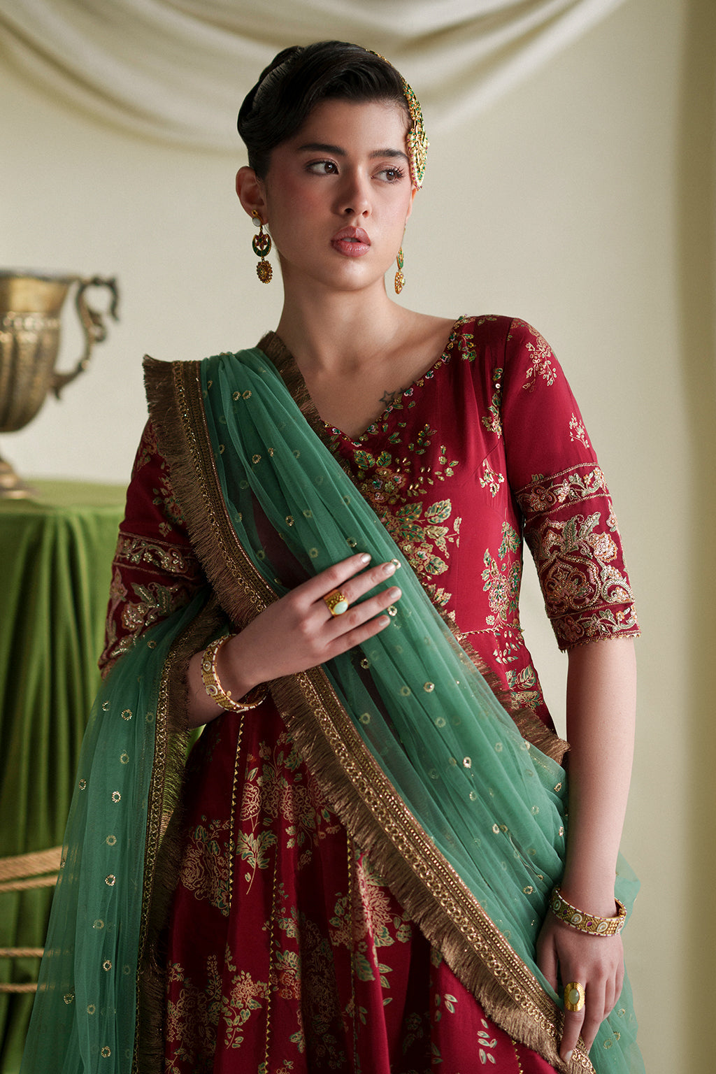 A graceful coral angrakha adorned with intricate embroidery and hand embellishments, paired with screen-printed crushed pants and a contrasting net dupatta for an elegant festive look.