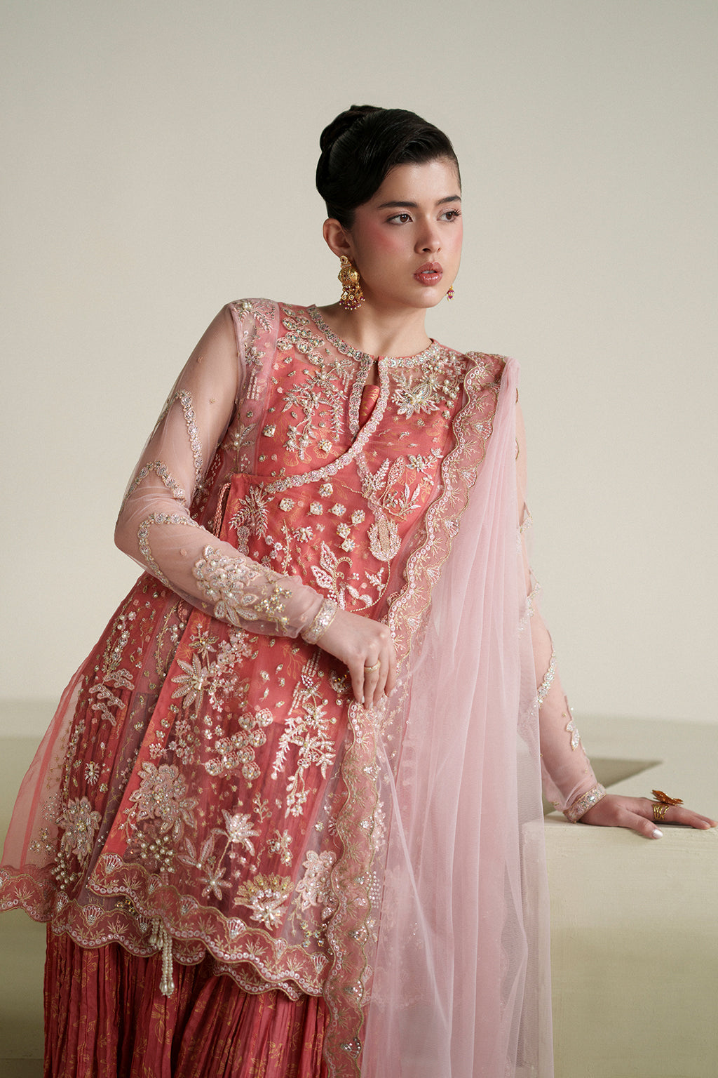 A graceful coral angrakha adorned with intricate embroidery and hand embellishments, paired with screen-printed crushed pants and a contrasting net dupatta for an elegant festive look.