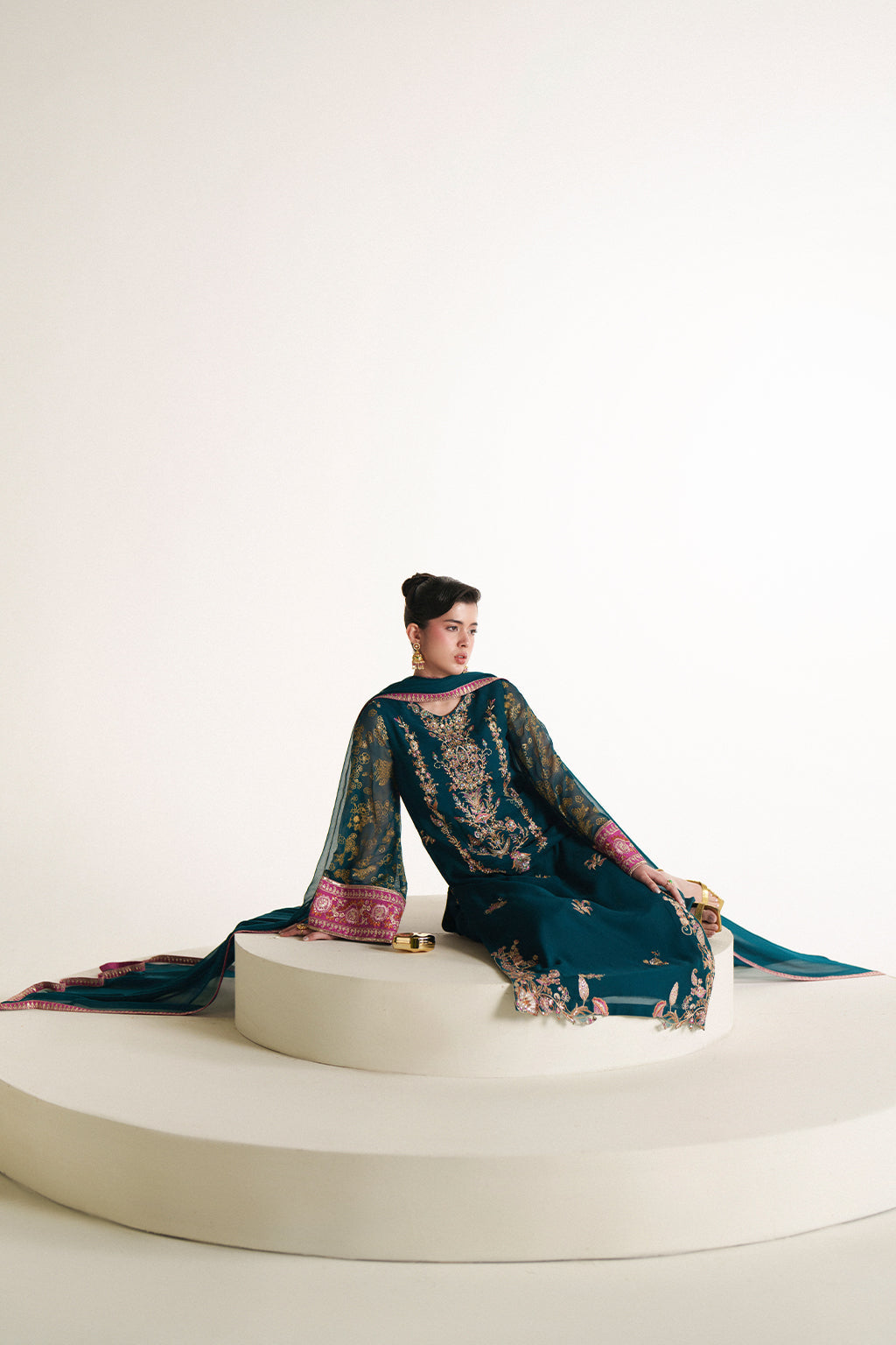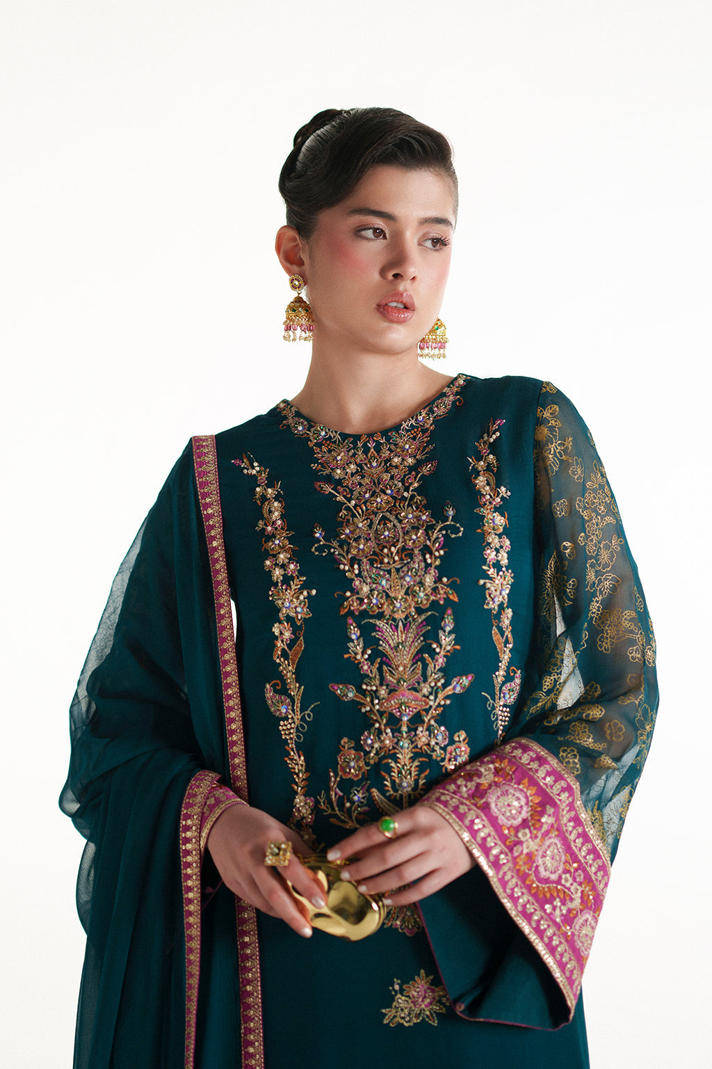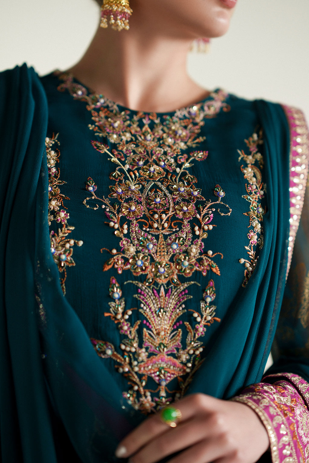 A rich teal green chiffon long shirt adorned with vibrant embroidered details, paired with a matching chiffon dupatta and plain trousers for an elegant, refined look.