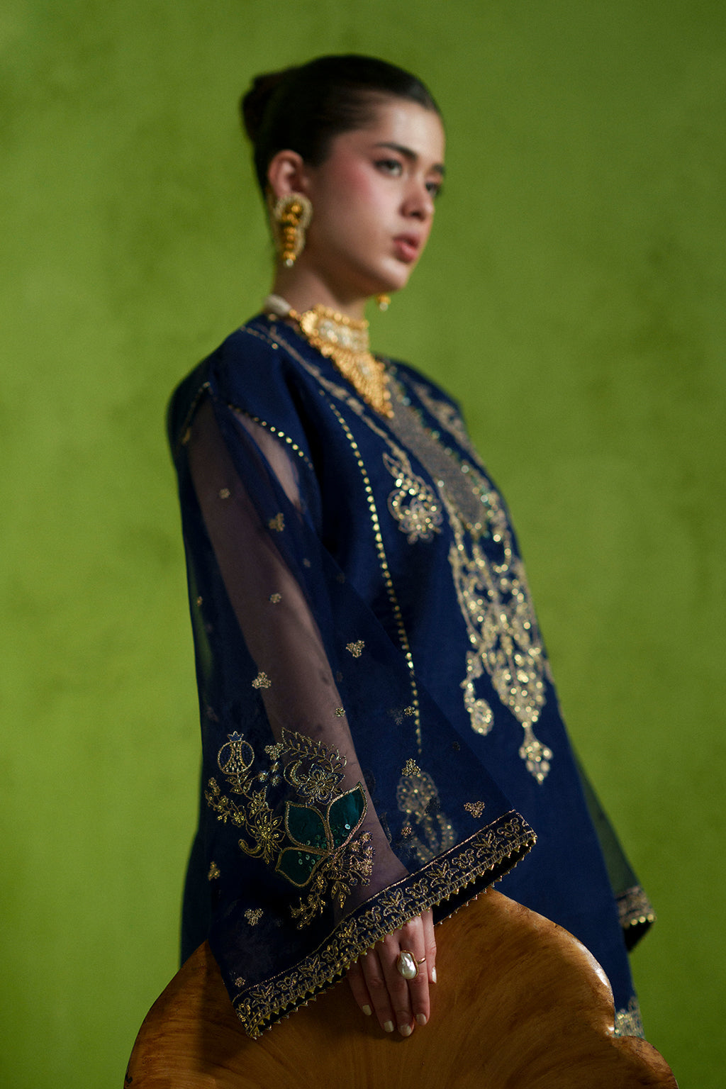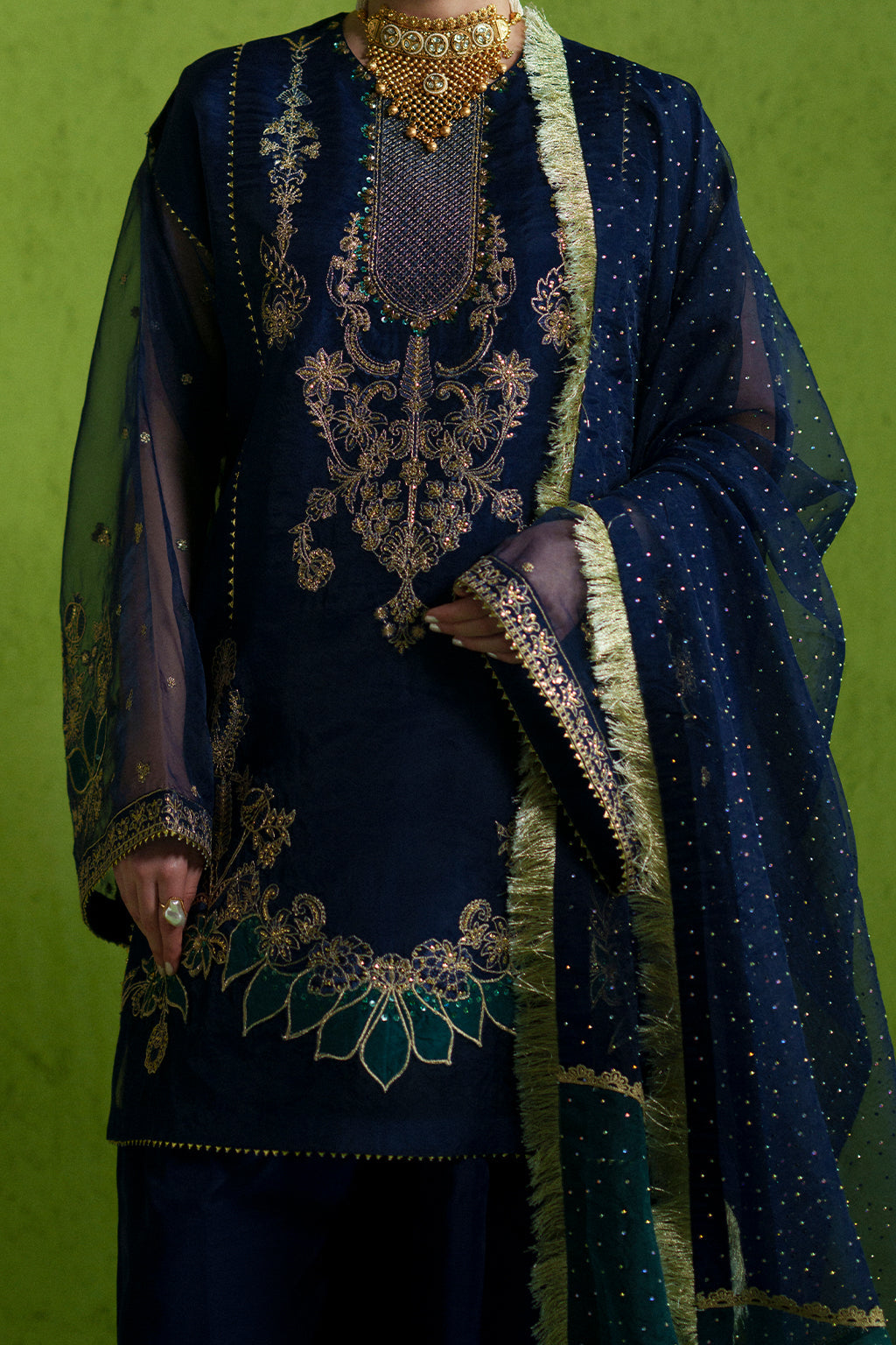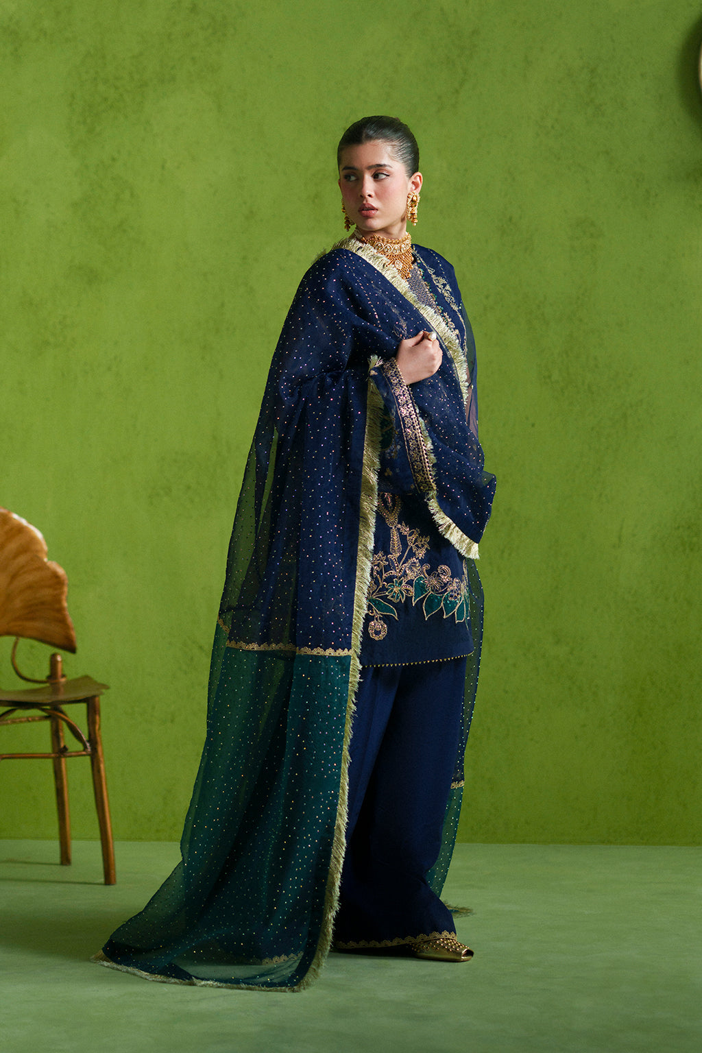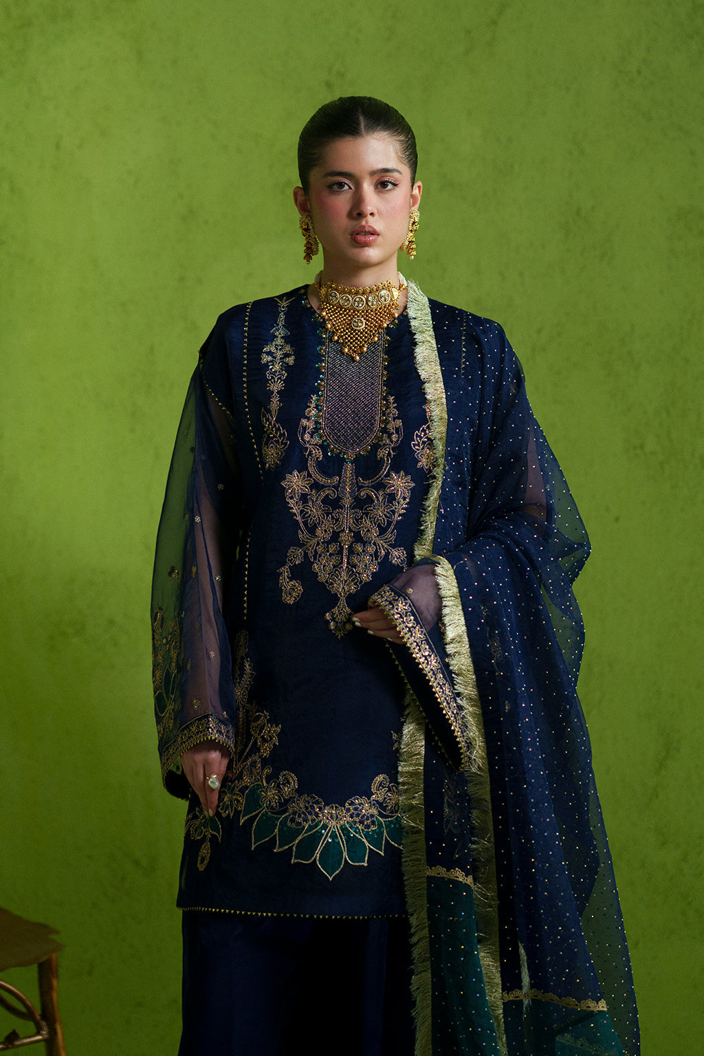 A delicate embroidered shirt intricately detailed with hand embellishments, paired with a flowing chiffon dupatta and plain trousers for a timeless, elegant look.