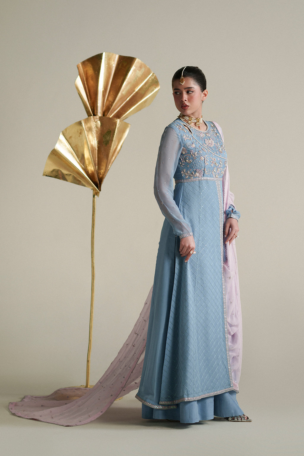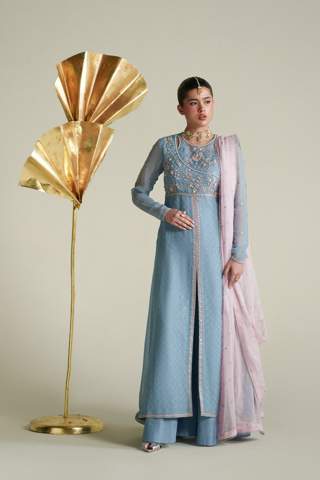 A soft pastel fusion-cut shirt featuring a delicately embroidered and hand-embellished bodice, paired with a contrasting dupatta and sharara for an elegant, contemporary look.