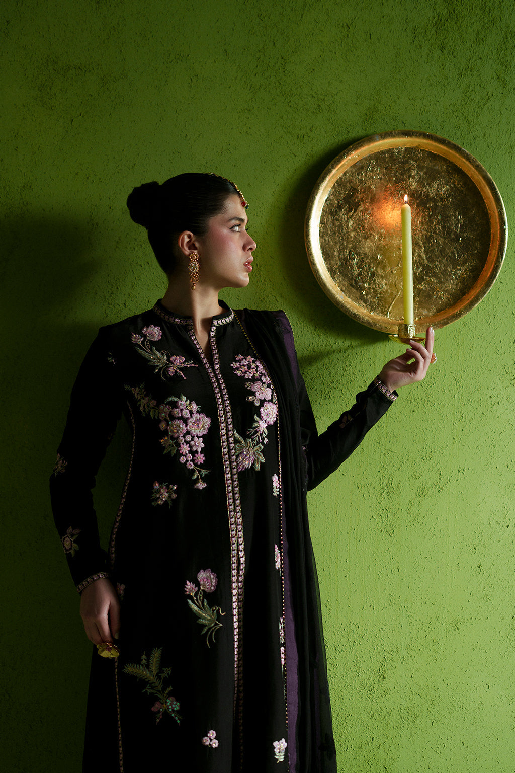 A delicate embroidered shirt intricately detailed with hand embellishments, paired with a flowing chiffon dupatta and plain trousers for a timeless, elegant look.