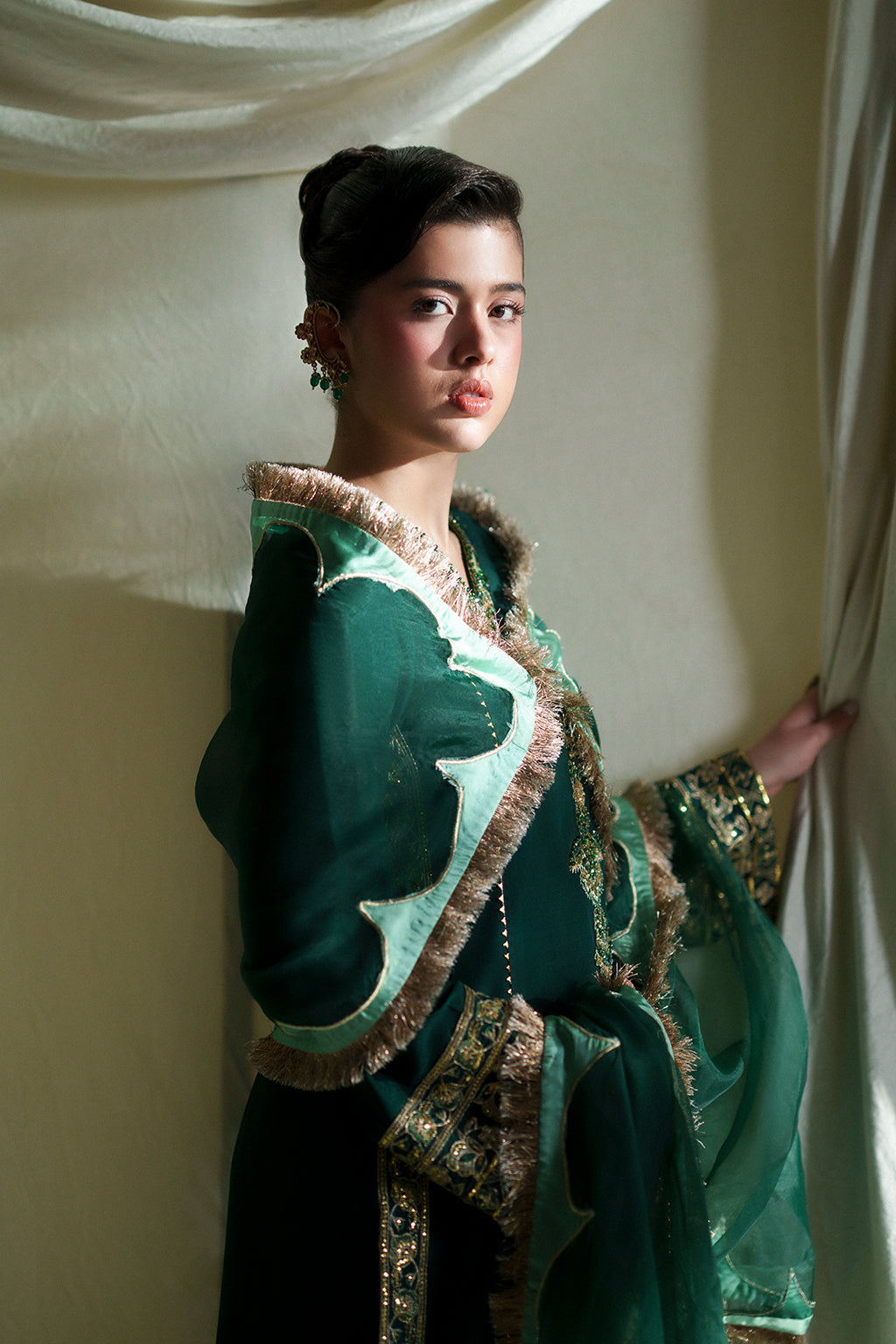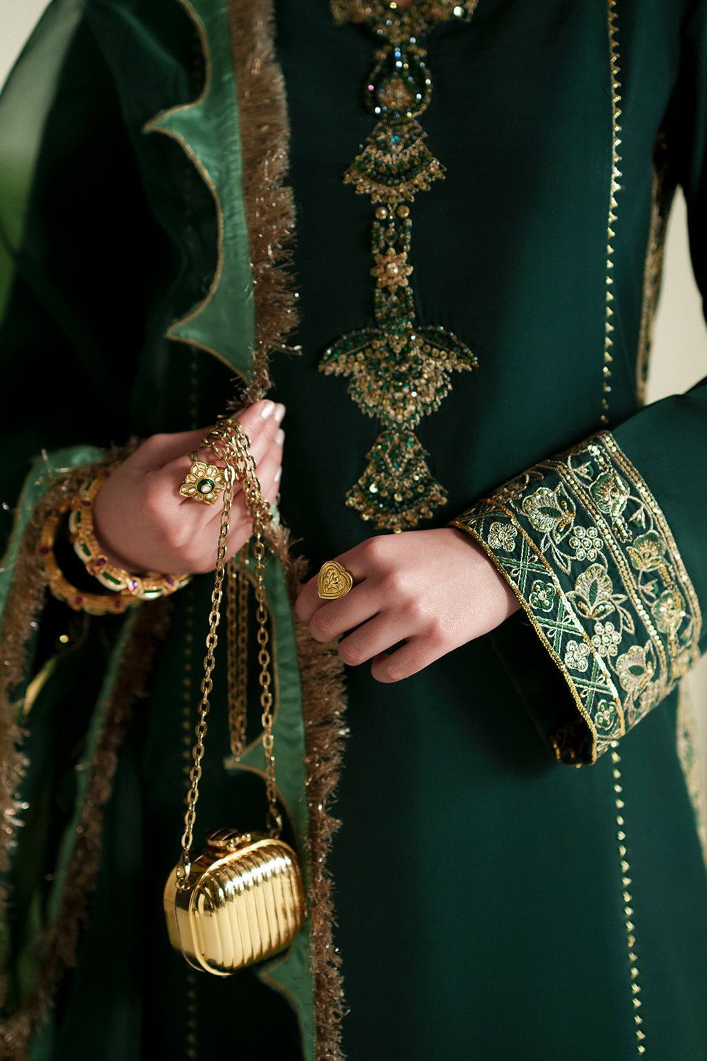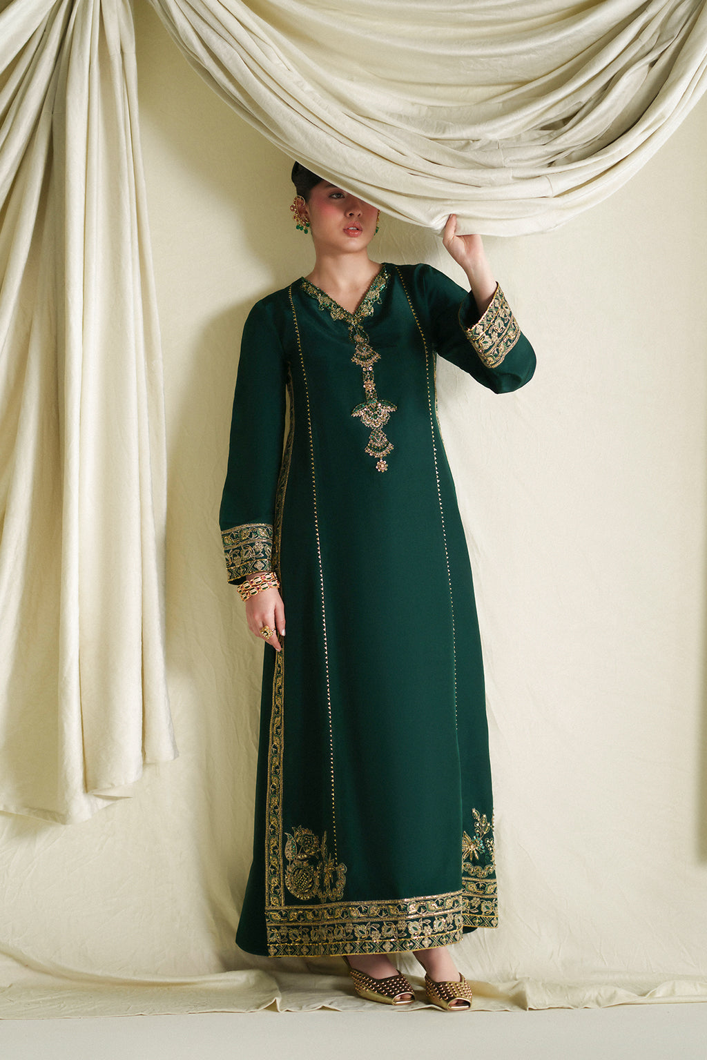 A classy and delicate silk long shirt intricately detailed with hand embellishments, paired with a beautifully color-blocked chadar and plain pants for an elegant, timeless look.
