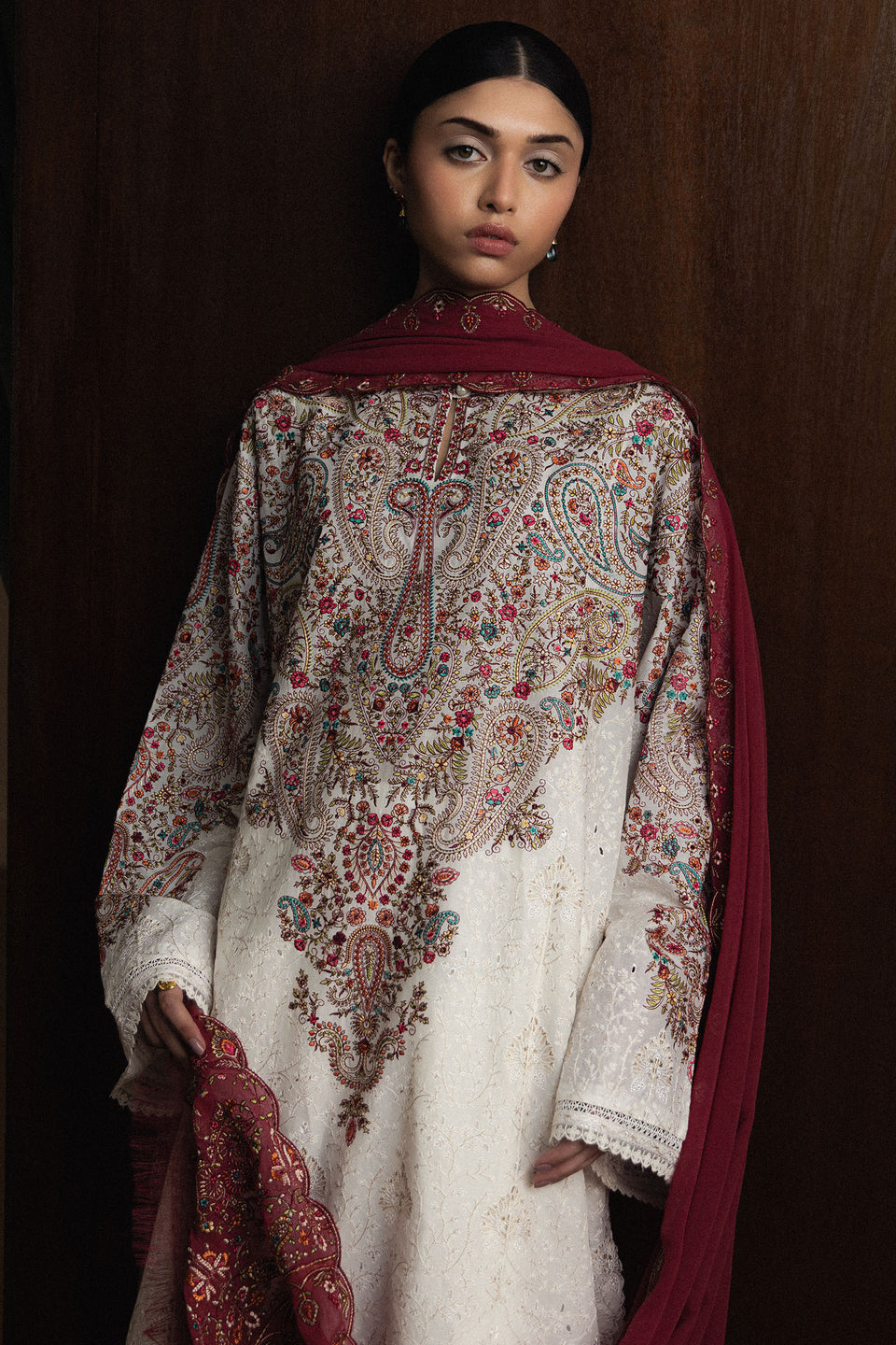 Hikari is crafted in white with Kashmiri and kashidakari-inspired embroidery, paired with a terracotta embroidered dupatta adorned with delicate Kashmiri motifs. Detailed with organza borders, embroidered panels, and matching dyed cambric trousers, the ensemble exudes heritage-rooted sophistication and understated elegance.