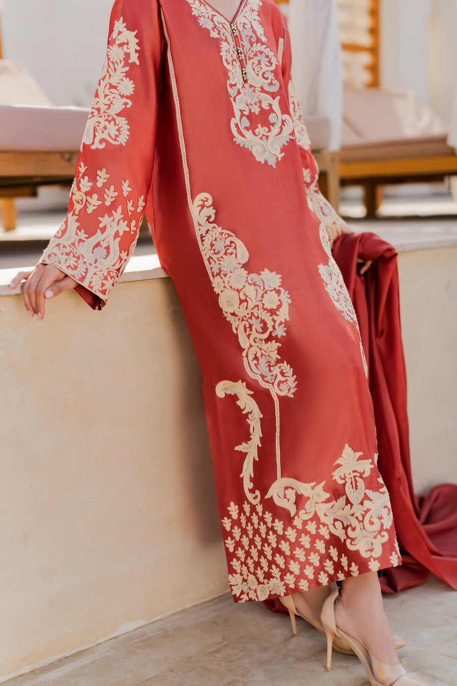 The shirt is beautifully embellished with intricate hand-done aari embroidery, reflecting fine artisanal craftsmanship.