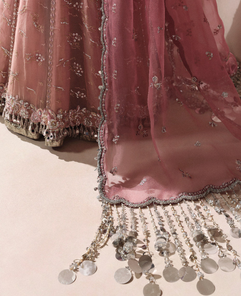 In dreamy dusty peach, this organza paneled pishwas captures the essence of feminine grace. The bodice shimmers with an intricate silver sequin jaal, while cascading panels bloom with delicate floral embroidery framed in soft pink satin for a whisper of refinement. Paired with an ethereal pink organza dupatta, the ensemble exudes quiet grandeur, a perfect harmony of charm and sophistication, designed to leave a graceful impression wherever you go.