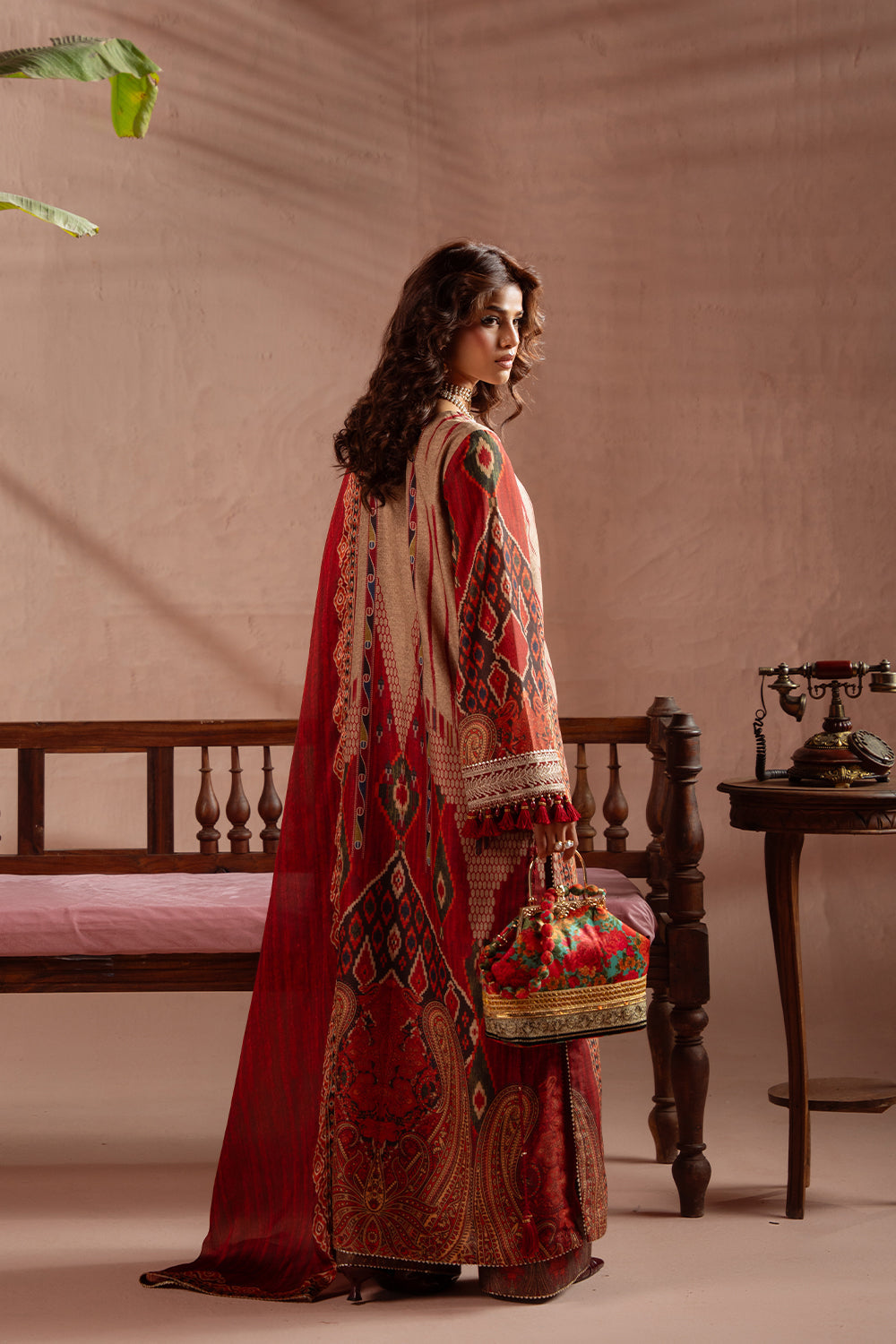 DESCRIPTION: This elegant ensemble is tailored from luxurious silk fabric, beautifully enhanced with embroidery and intricate resham detailing. A matching printed silk dupatta completes the look with effortless sophistication and grace.