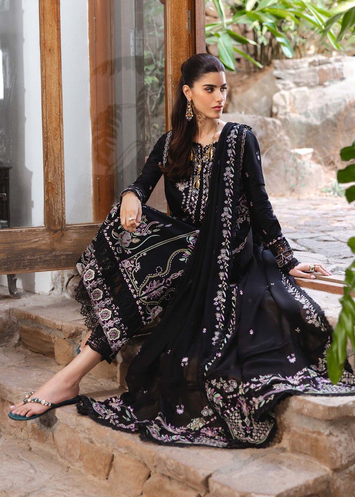 Experience the seamless fusion of classic charm and modern style with this gorgeous black lawn outfit. Delicate pastel embroidery adorns the open-front shirt, while intricate stitching and embroidery on the sleeves and hem showcase masterful craftsmanship. Paired with matching black cambric pants featuring an embroidered border, this outfit offers both comfort and sophistication. A beautifully crafted chiffon dupatta with heavy embroidery and lace finishing adds a touch of luxury to this stunning outfit. This outfit is perfect for fancy dinners and evening soirees, a perfect breezy ensemble for warm nights.