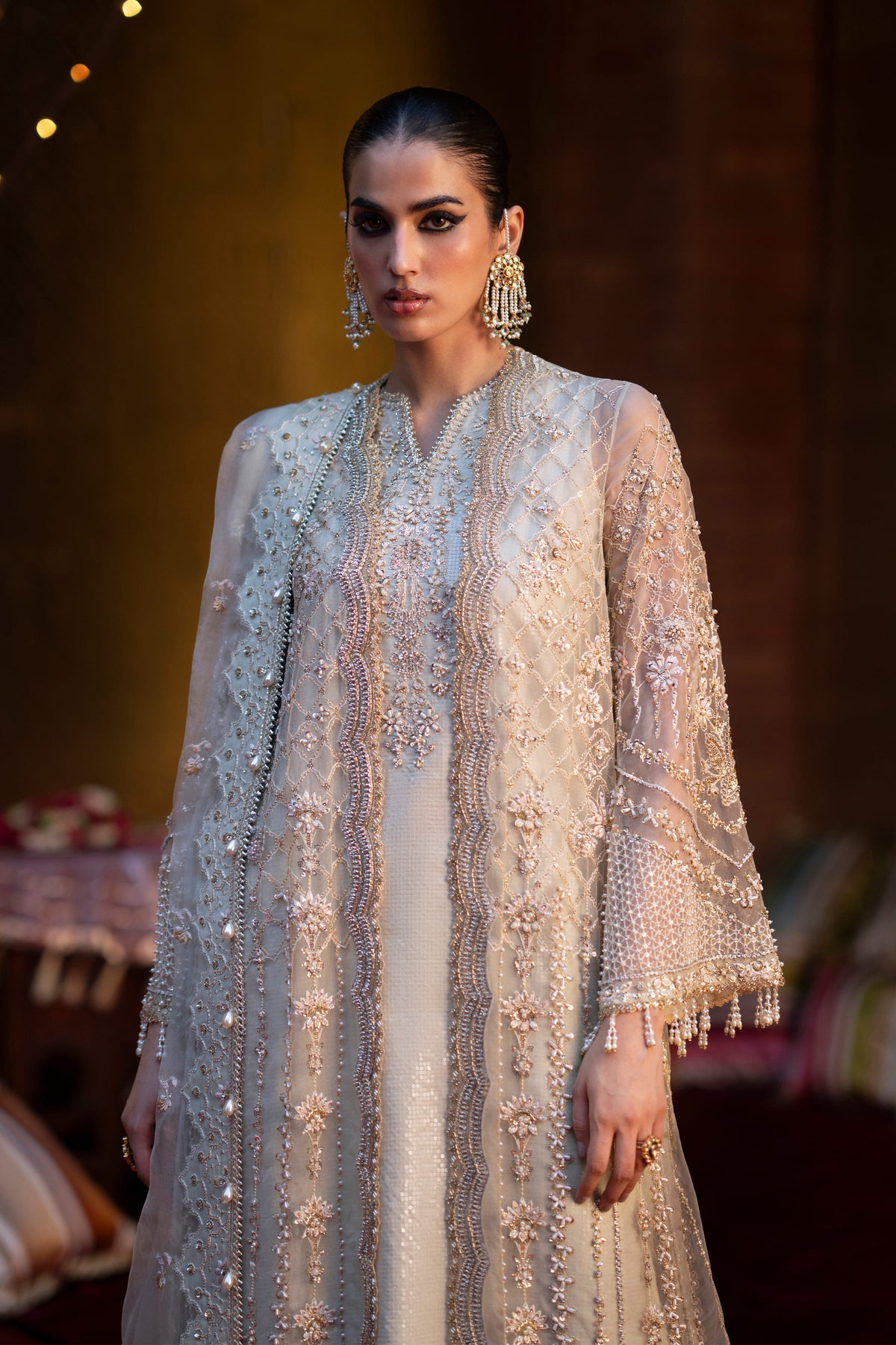 An ethereal mint green open-style gown adorned with delicate handwork, paired with a self-on-self sequined inner shirt for a subtle shimmer. Completed with an intricately embroidered dupatta, this ensemble blends elegance with timeless charm—perfect for making a graceful statement.