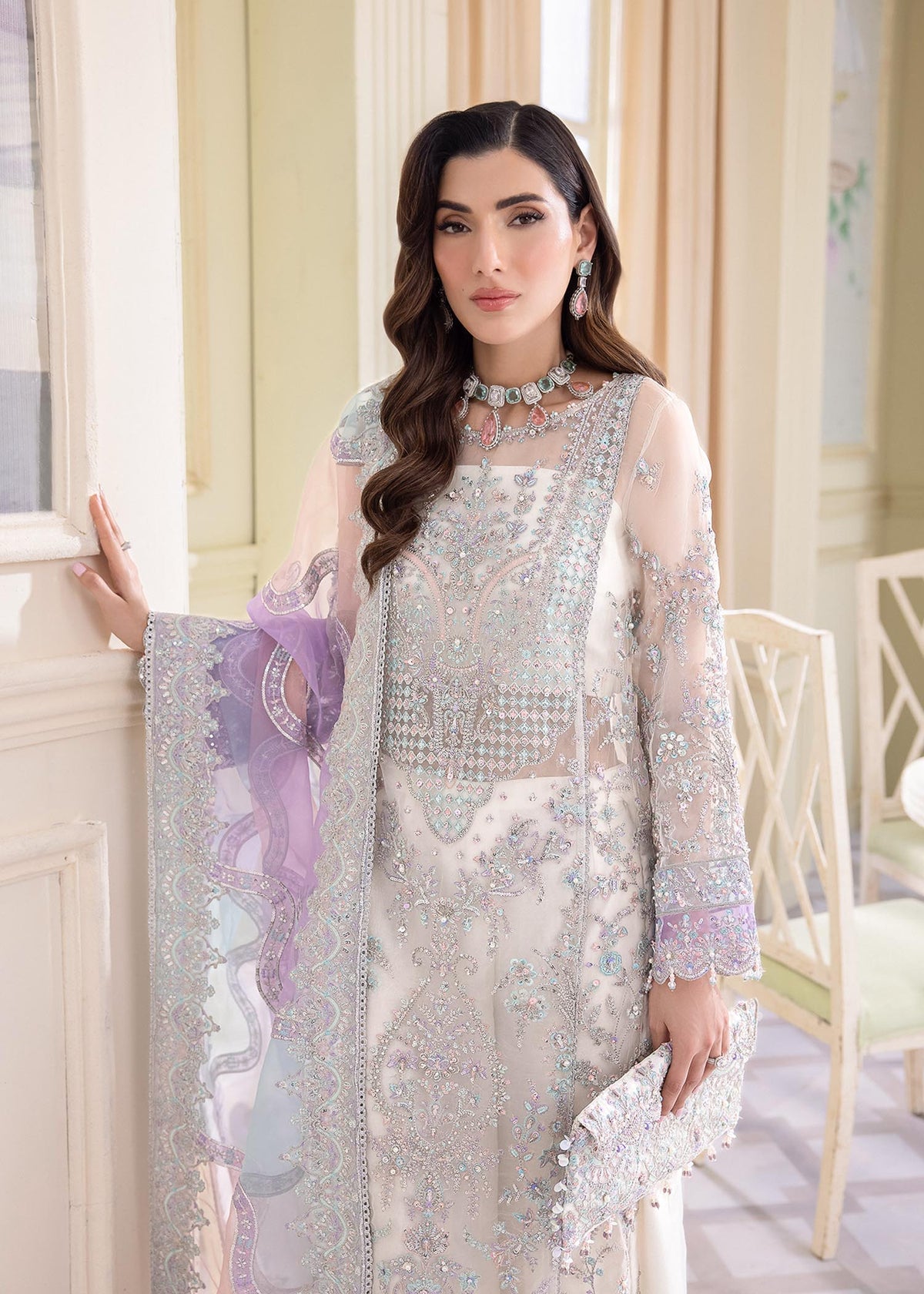 The white long shirt exudes timeless elegance with its clean embroidery and exquisite embellishment. Delicate floral motifs, intricate patterns, shimmering embellishments and double tone sleeves border adorn the dress, creating a mesmerizing tapestry of beauty. Complementing the shirt with the flare pants, which add a modern twist to the traditional attire. Adorned with a border along the bottom hem, the pants elevate the ensemble with their subtle detailing and graceful flare. The combination of the