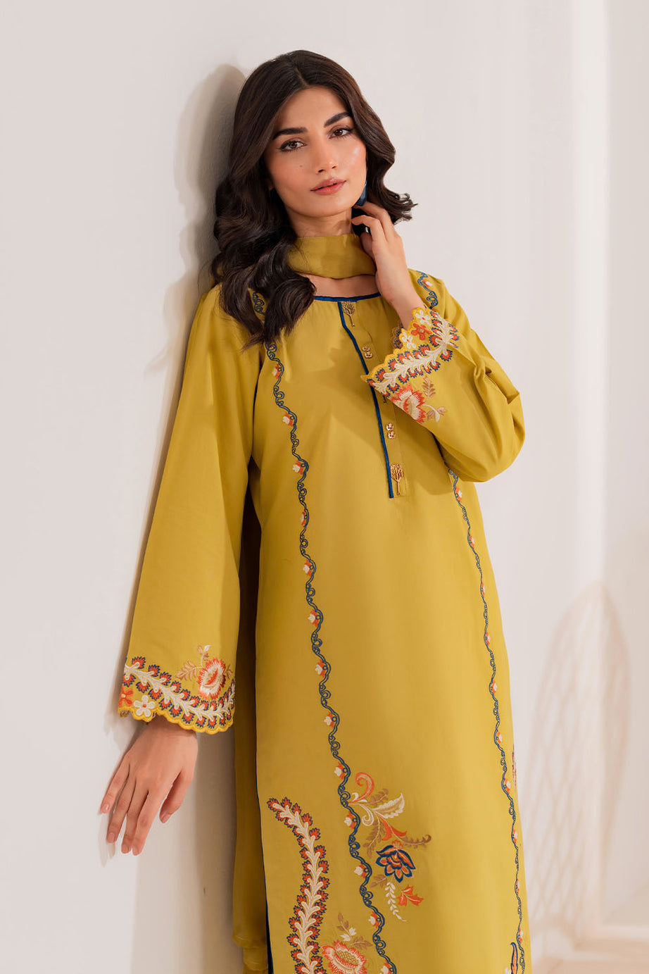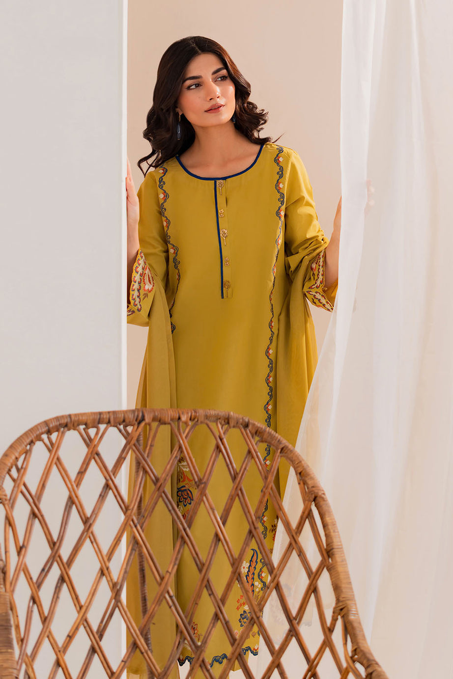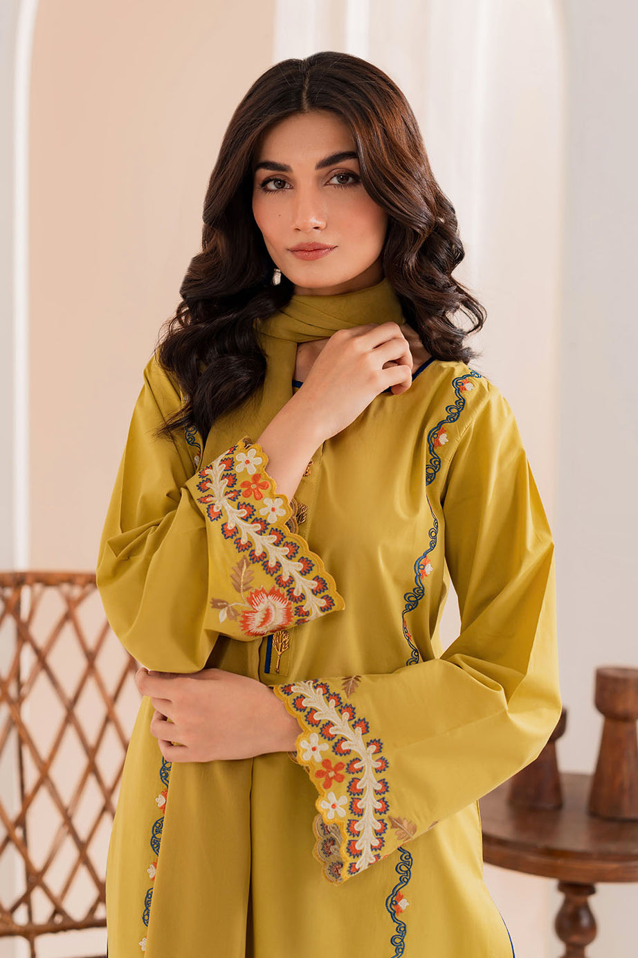 Elevate your wardrobe with this exquisite 2 piece embroidered outfit in a serene lime green hue. Crafted from premium quality lawn, this ensemble features a beautifully embroidered shirt adorned with delicate threadwork, with gold button detailing on the neckline that exudes elegance and cultural charm. The embroidery showcases intricate floral motifs and traditional patterns, adding a touch of sophistication to your everyday or festive look. The matching trousers are tailored for comfort and style, completing the outfit with a graceful silhouette.