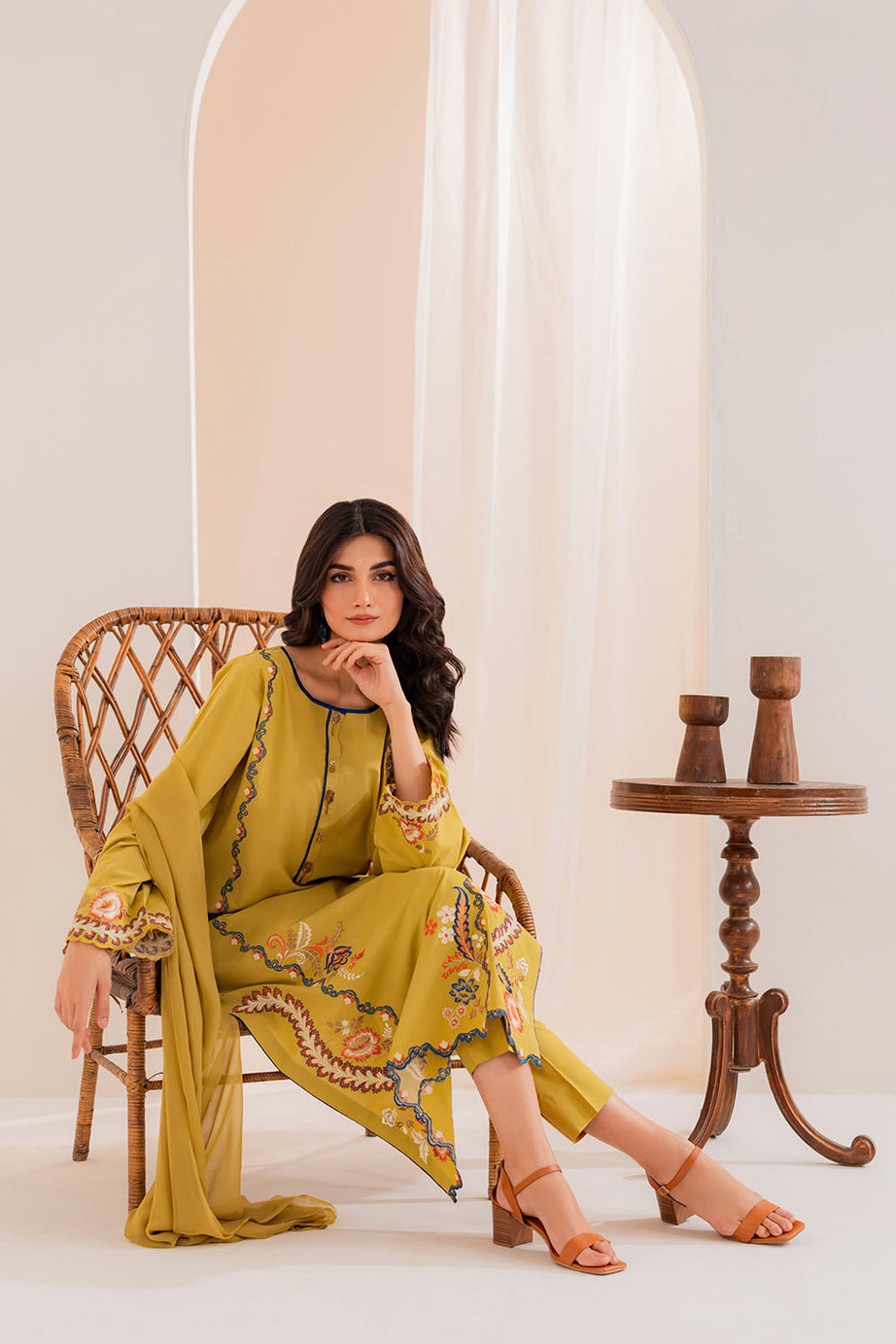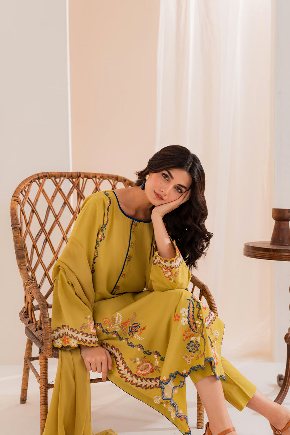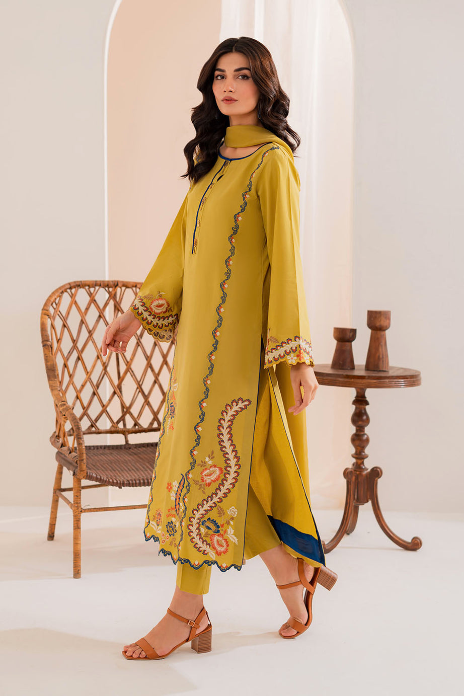 Elevate your wardrobe with this exquisite 2 piece embroidered outfit in a serene lime green hue. Crafted from premium quality lawn, this ensemble features a beautifully embroidered shirt adorned with delicate threadwork, with gold button detailing on the neckline that exudes elegance and cultural charm. The embroidery showcases intricate floral motifs and traditional patterns, adding a touch of sophistication to your everyday or festive look. The matching trousers are tailored for comfort and style, completing the outfit with a graceful silhouette.