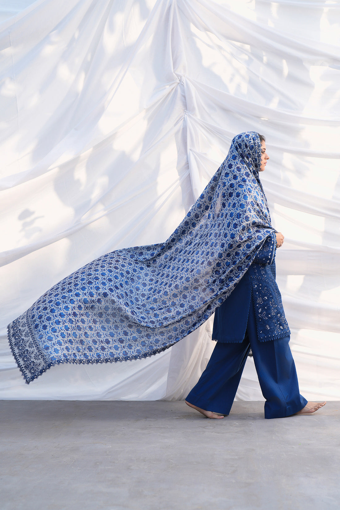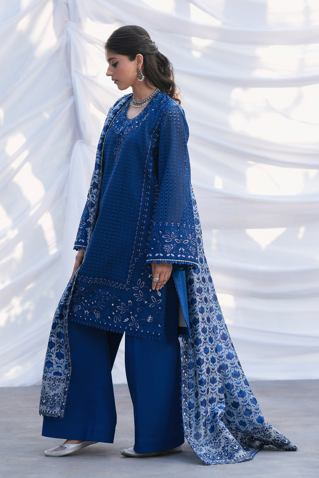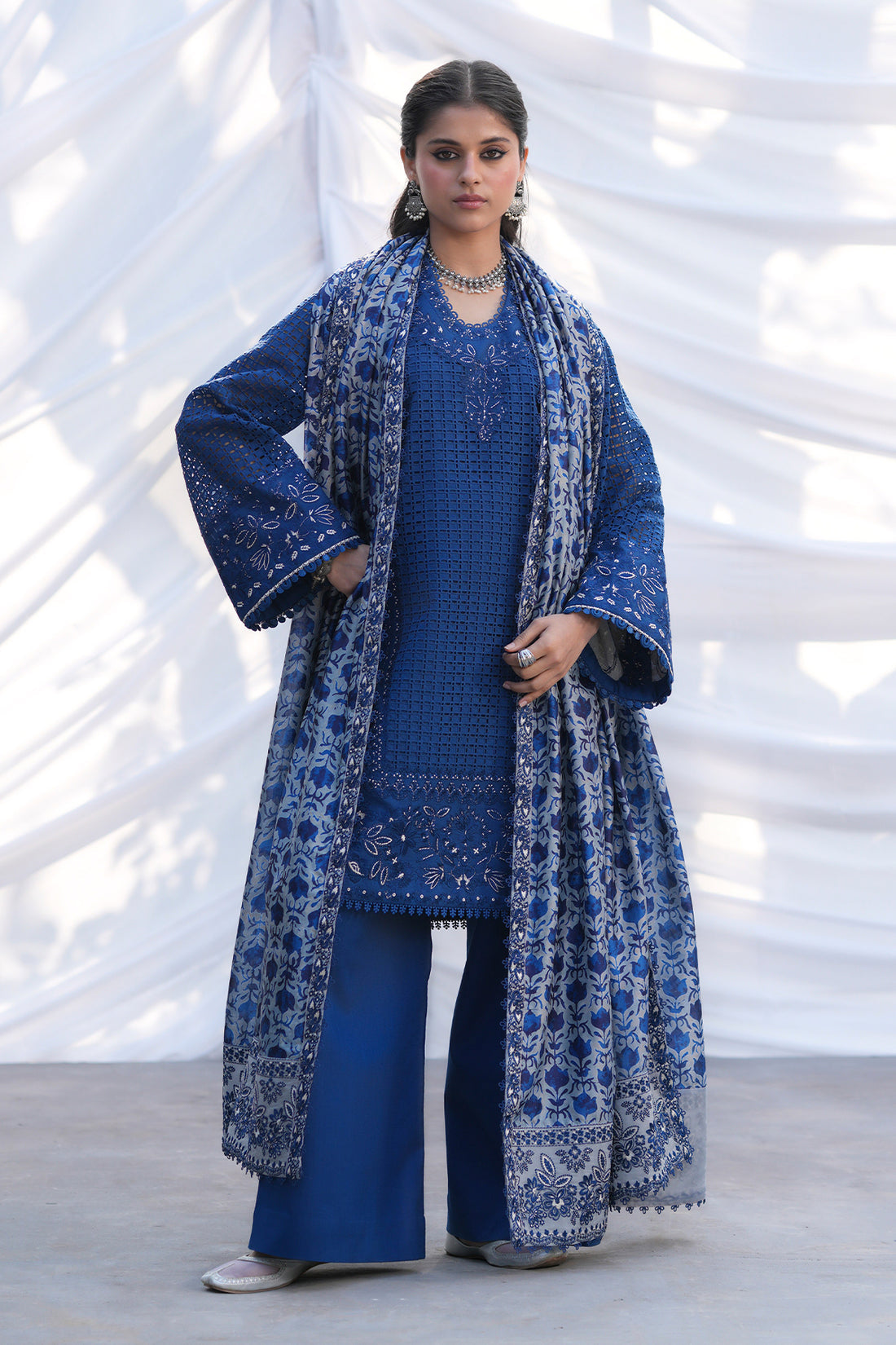 A regal Ink blue ensemble featuring an intricately cutwork embroidered kurta with farshi shalwar, and a beautifully detailed silk dupatta, perfect for festive elegance.