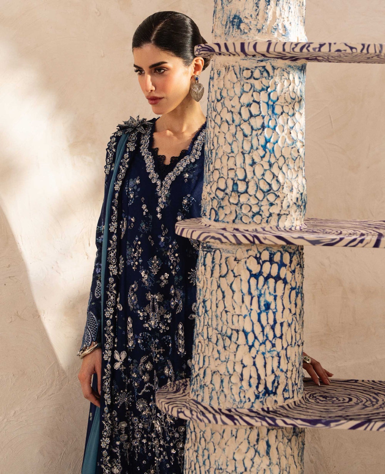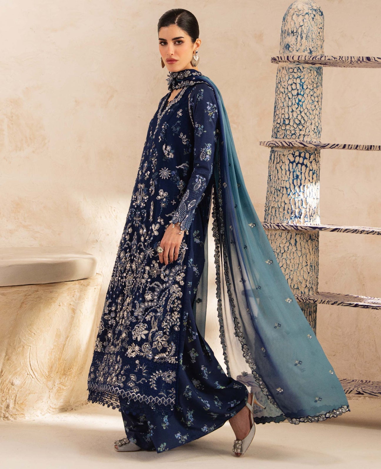 An elegant formal ethnic ensemble exuding a regal, contemporary charm. Crafted on a deep navy blue net base, the outfit is elevated with intricate silver embroidery that forms a luminous contrast. The long, straight-cut kurta features finely detailed embellishment along the neckline, sleeves, and hem, with dense floral and ornamental motifs cascading across the front. It is paired with a printed raw silk dhakka shalwar with coordinated printed lining, adding depth and texture. A sheer, two-toned teal and blue dupatta with subtle embellishment completes the look, lending softness and graceful balance to the richly embroidered silhouette.