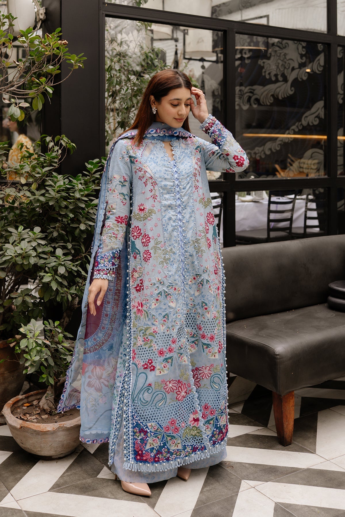 A mesmerizing blend of aqua hues adorned with intricate embroideries and digital prints. Luxe viscose silk borders delicate organza accents and a statement printed dupatta elevate the elegance while a gracefully dyed cotton culottes completes the look. A timeless symphony of color and craftsmanship.
