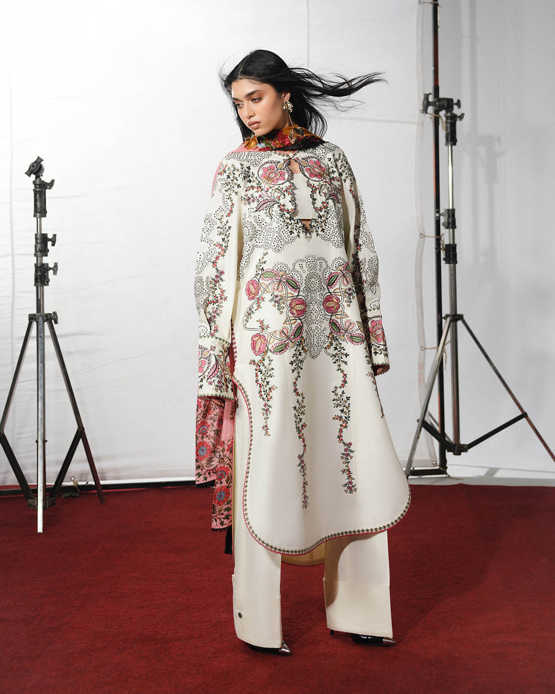 A refined ivory long shirt, lavishly embellished with multicolour traditional embroidery, embodies classic elegance, while the fitted sleeves—adorned with the same intricate motifs—add a poised and graceful structure. It is paired with a softly dyed ivory trouser that enhances the ensemble’s timeless appeal, and finished with a digitally printed silk dupatta, bringing a delicate infusion of colour, fluidity, and understated luxury to the overall look.