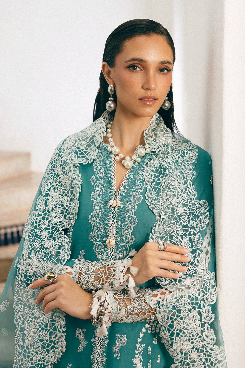 Gracefully elegant, this three-piece ensemble showcases an ice blue base adorned with delicate floral embroidery in a subtle mono-textured finish, paired with a finely detailed organza dupatta.