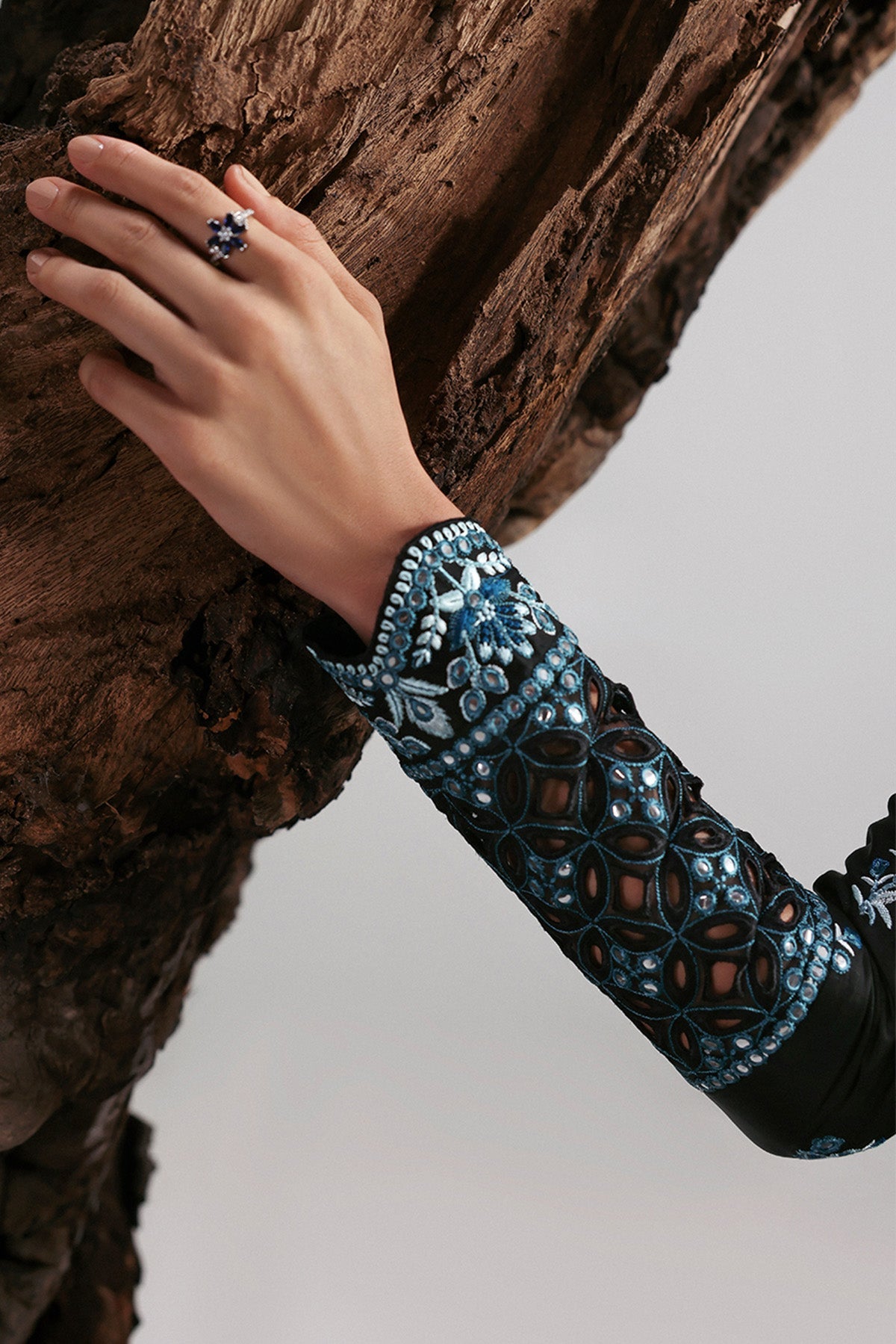 Midnight allure in black and blue — a commanding silhouette framed with intricate azure embroidery that trails down the length of the ensemble. The contrast of midnight black and icy blue lends drama and elegance, while the flowing form embodies sophistication with a modern edge.