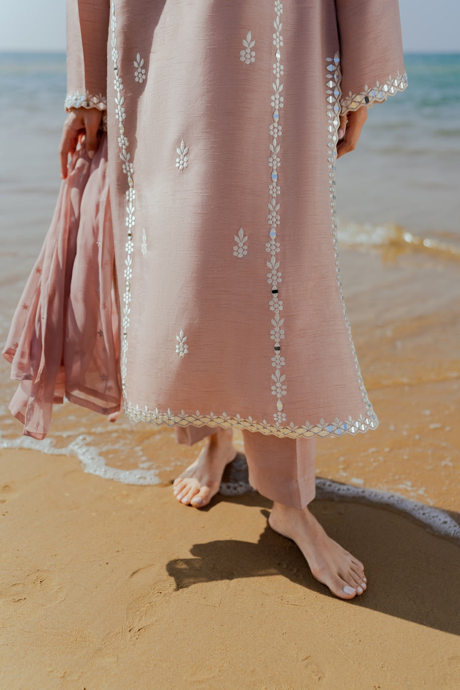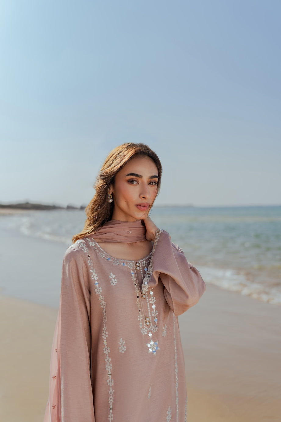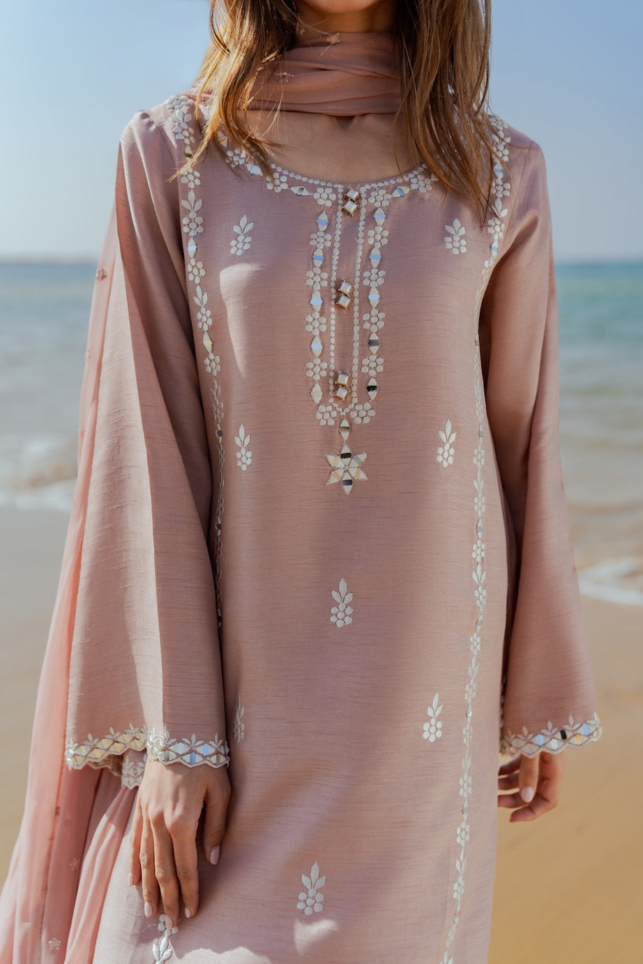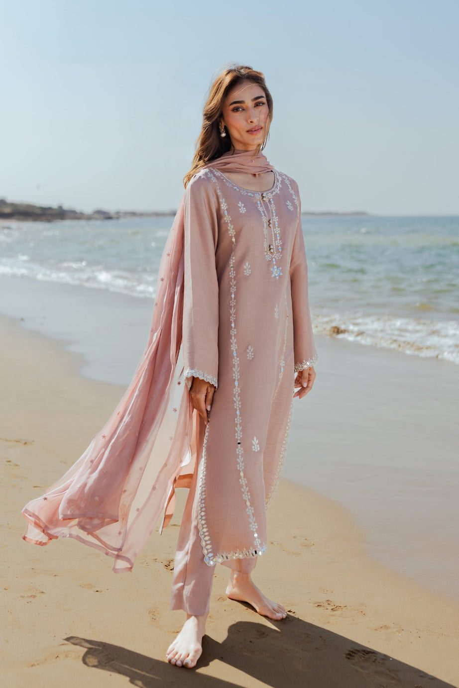 Embrace festive elegance this Eid with our chai pink 2-piece outfit, featuring a hand-embroidered shirt adorned with delicate mirror work. The intricate detailing adds a subtle sparkle, beautifully complementing the soft, feminine hue. Paired with sleek tapered pants, the ensemble offers a refined and modern silhouette. Perfectly balanced between tradition and contemporary style, this outfit is ideal for Eid celebrations and daytime festivities.
