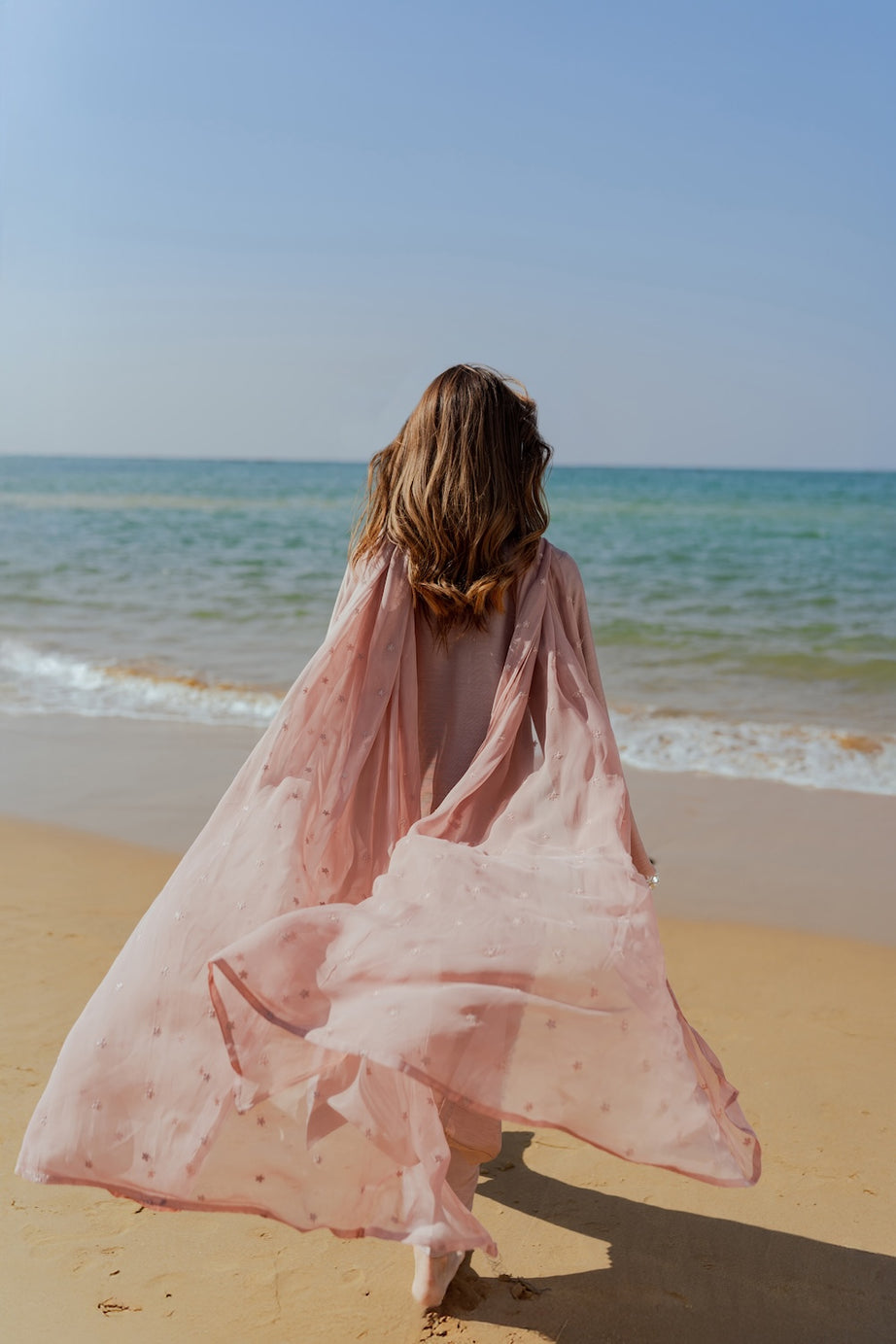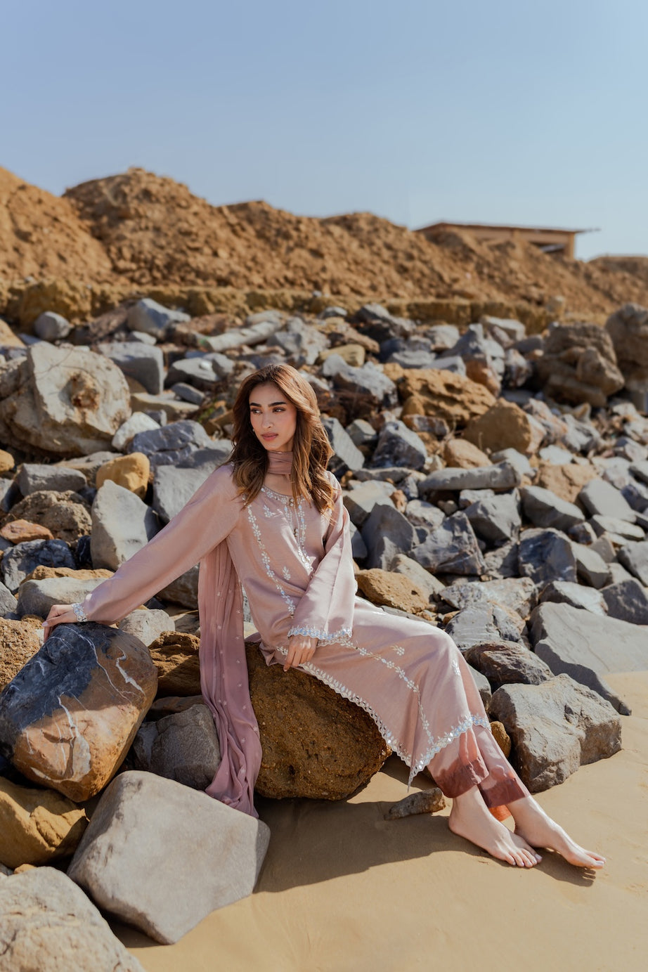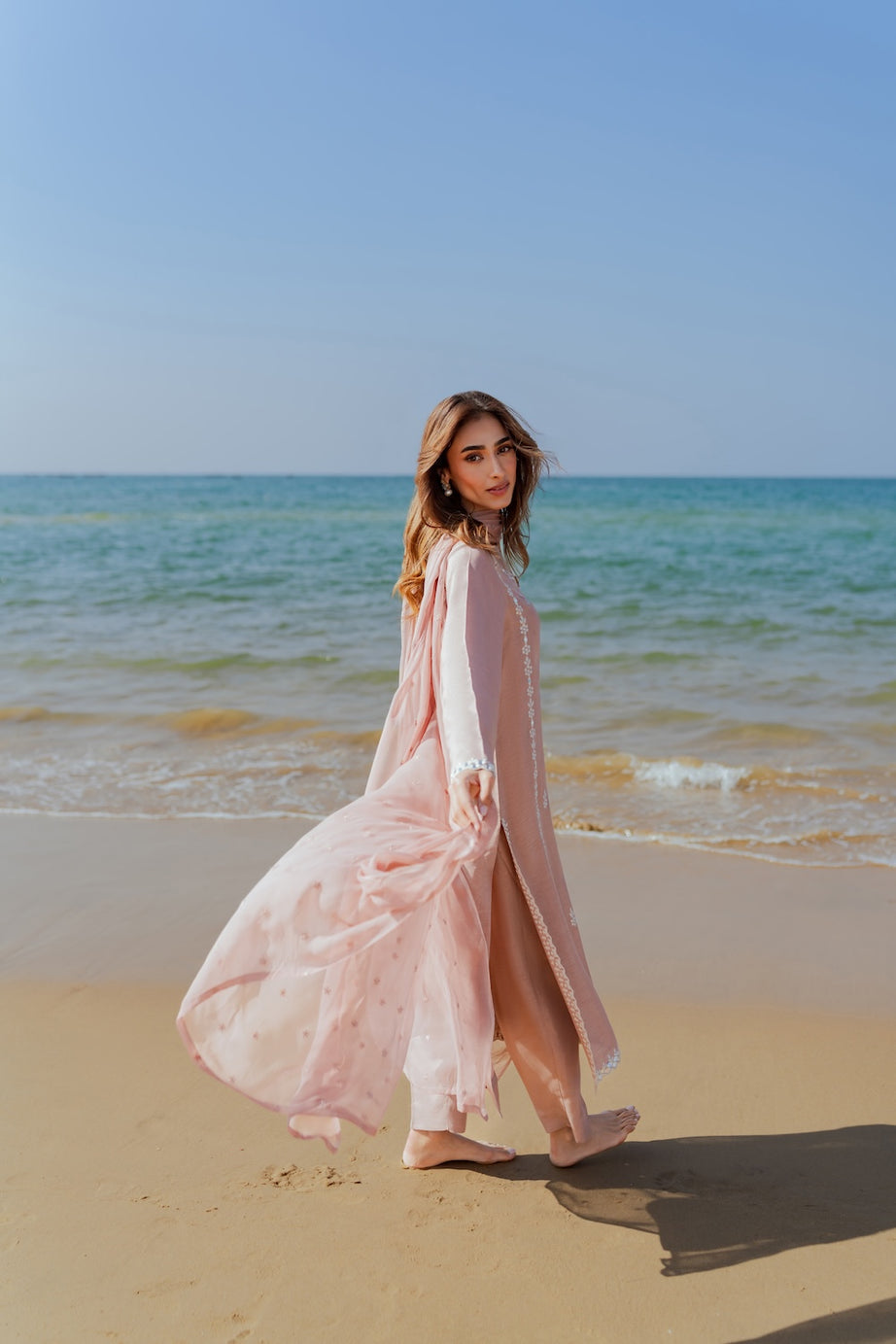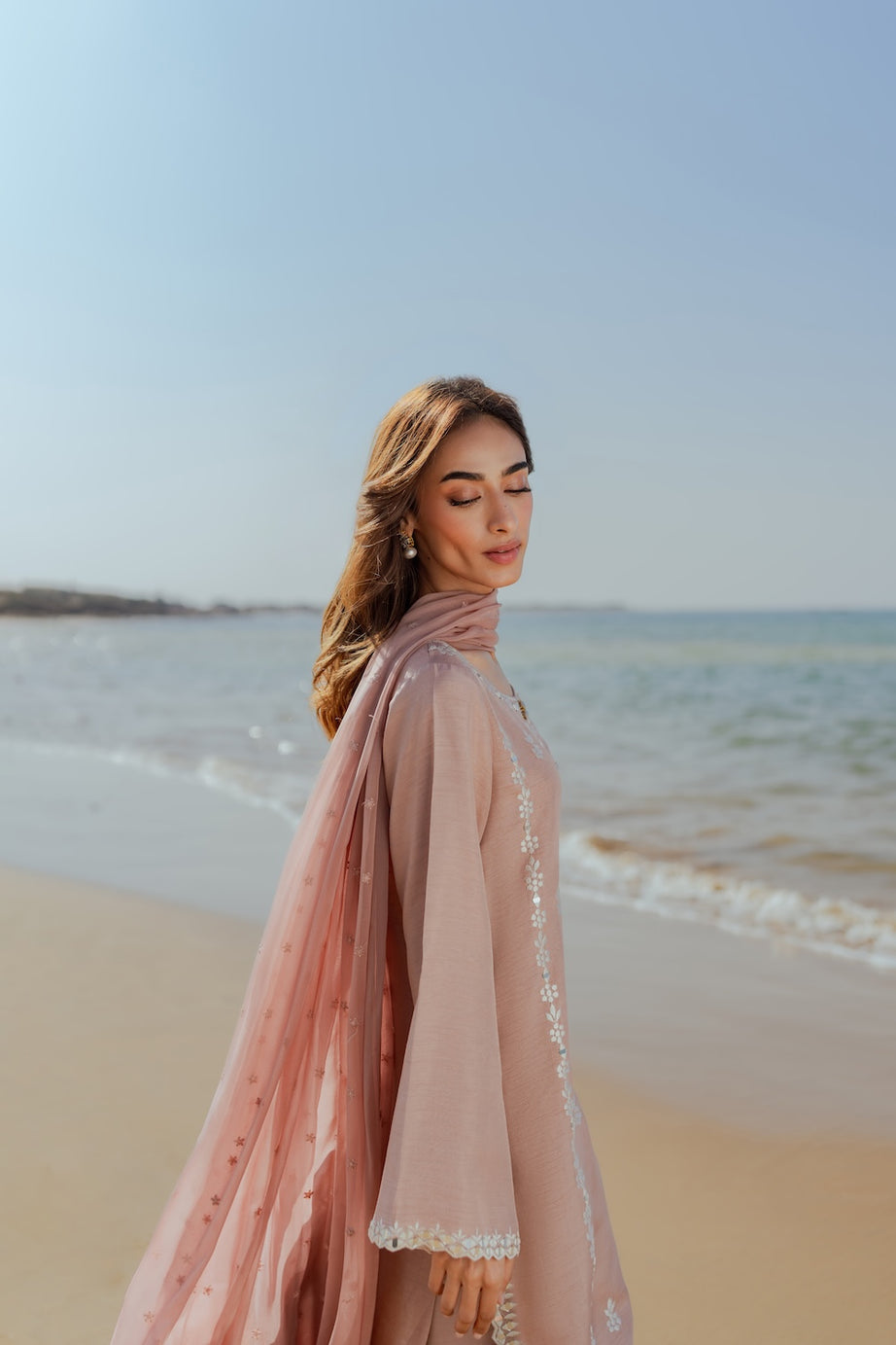 Embrace festive elegance this Eid with our chai pink 2-piece outfit, featuring a hand-embroidered shirt adorned with delicate mirror work. The intricate detailing adds a subtle sparkle, beautifully complementing the soft, feminine hue. Paired with sleek tapered pants, the ensemble offers a refined and modern silhouette. Perfectly balanced between tradition and contemporary style, this outfit is ideal for Eid celebrations and daytime festivities.