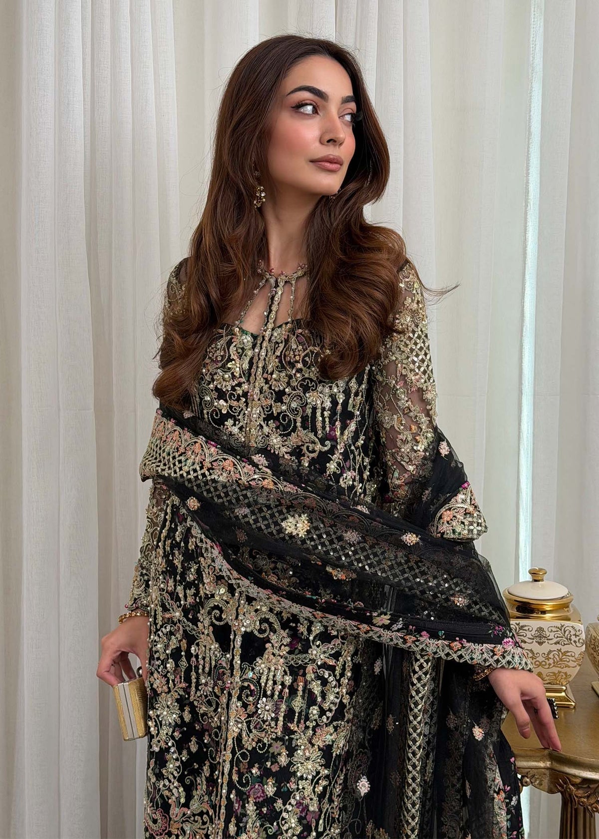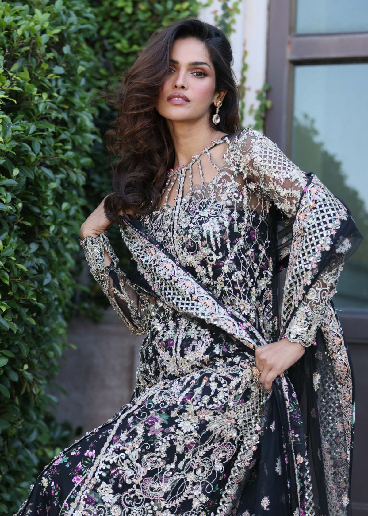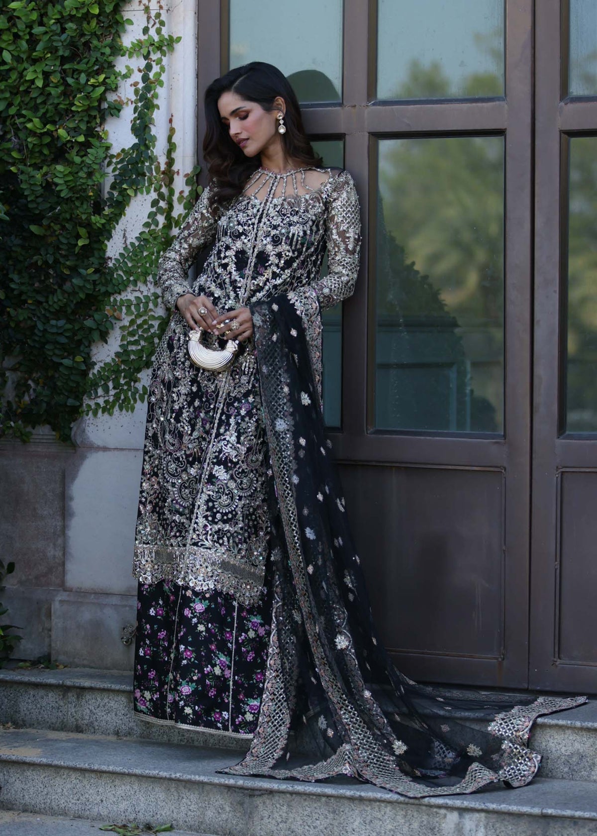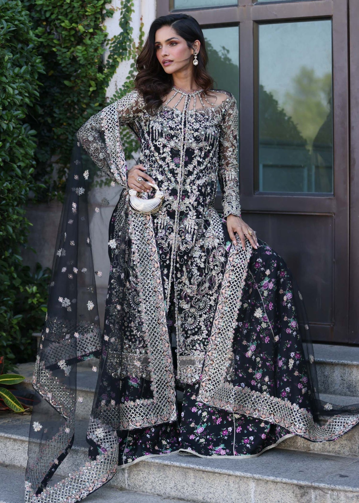 This sophisticated black ensemble features a front-open jacket dress adorned with a beautifully composed pattern that highlights clean lines and balanced detailing. The structured yet fluid silhouette brings a modern edge while preserving timeless elegance. Paired with a printed sharara pant, the look gains depth, movement, and striking visual contrast, while the coordinating dupatta completes the ensemble with refined harmony. Perfect for festive occasions and formal gatherings, this design seamlessly blends classic charm with contemporary sophistication.