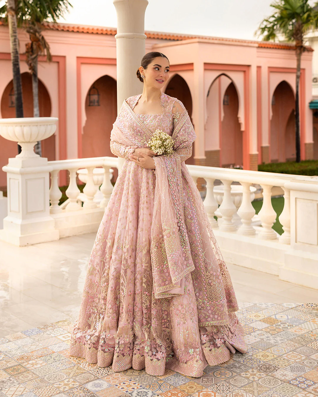 Reflecting the sophistication of a floor sweeping silhouette, Ruzova is a celestial assemblage of time-honoured crafts. The powder pink net pishwas dazzles with intricately crafted tilla and sequin motifs delicately arranged in blooming floral patterns that are highlighted with every step. This piece comes with a silk churidar and an artistically adorned sheer net dupatta making it a true treasure of your festive wardrobe.