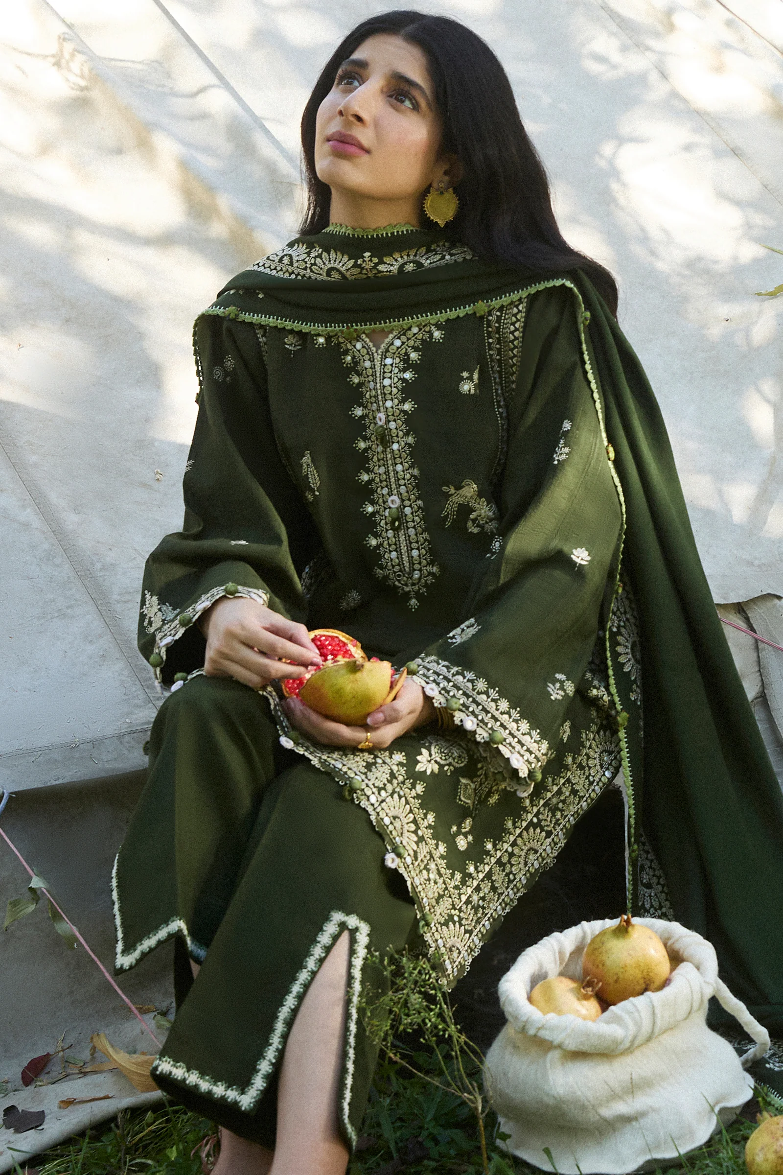 In a rich olive green canvas, Sabaaz unfolds like a winter dream, its tribal-inspired embroideries in soft ivory and deep olive delicately kissed by the subtle shimmer of mirror work. Paired with a tonal karandi dupatta, the fabric comes alive with ethereal floral motifs and finely detailed borders, evoking the crisp, invigorating air of a winter morning. The ensemble captures the quiet elegance of the season, with every detail wrapped in the serene, frosty embrace of winter, blending timeless tradition with a dreamlike quality that feels perfectly suited for the colder months.