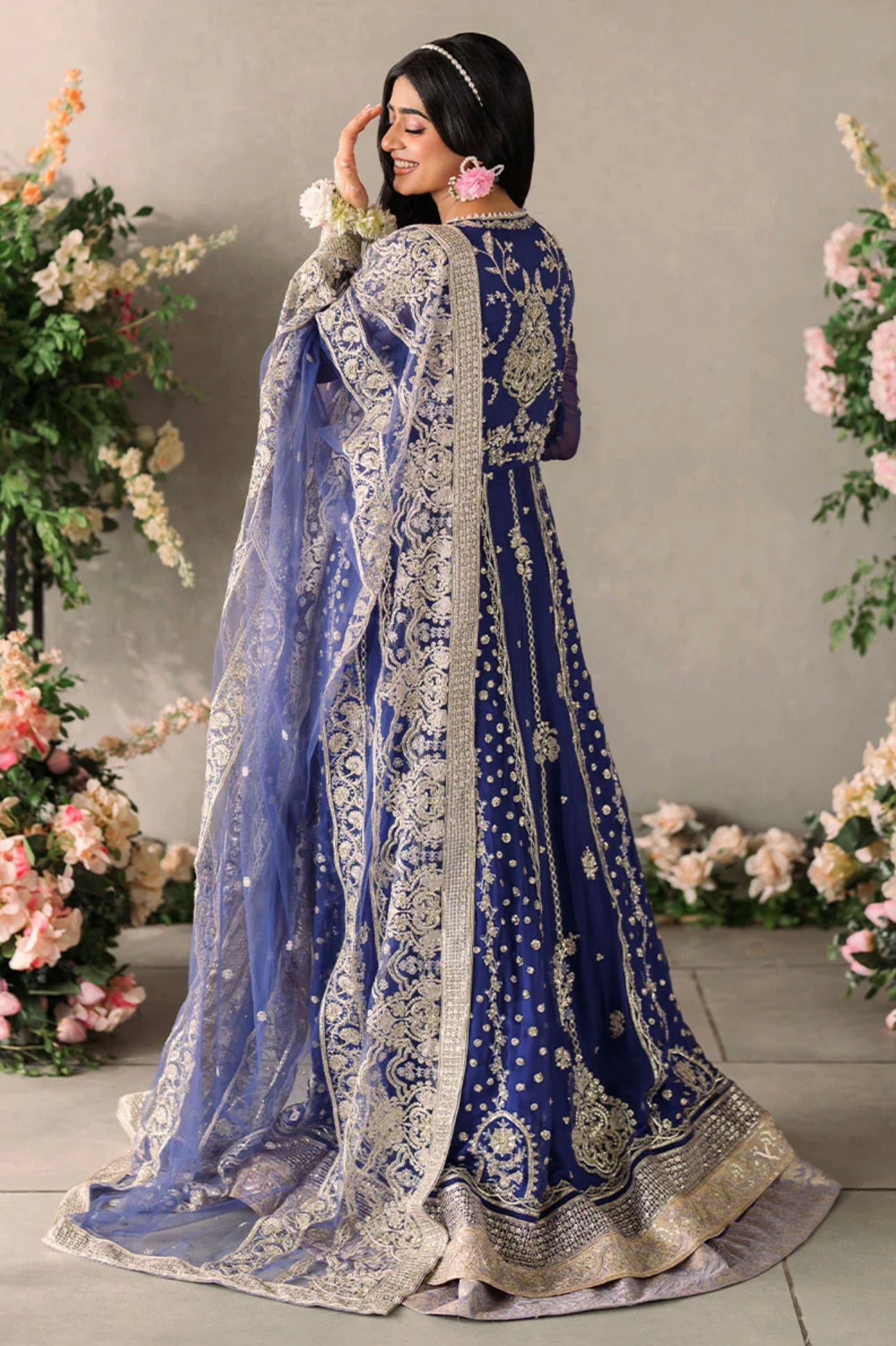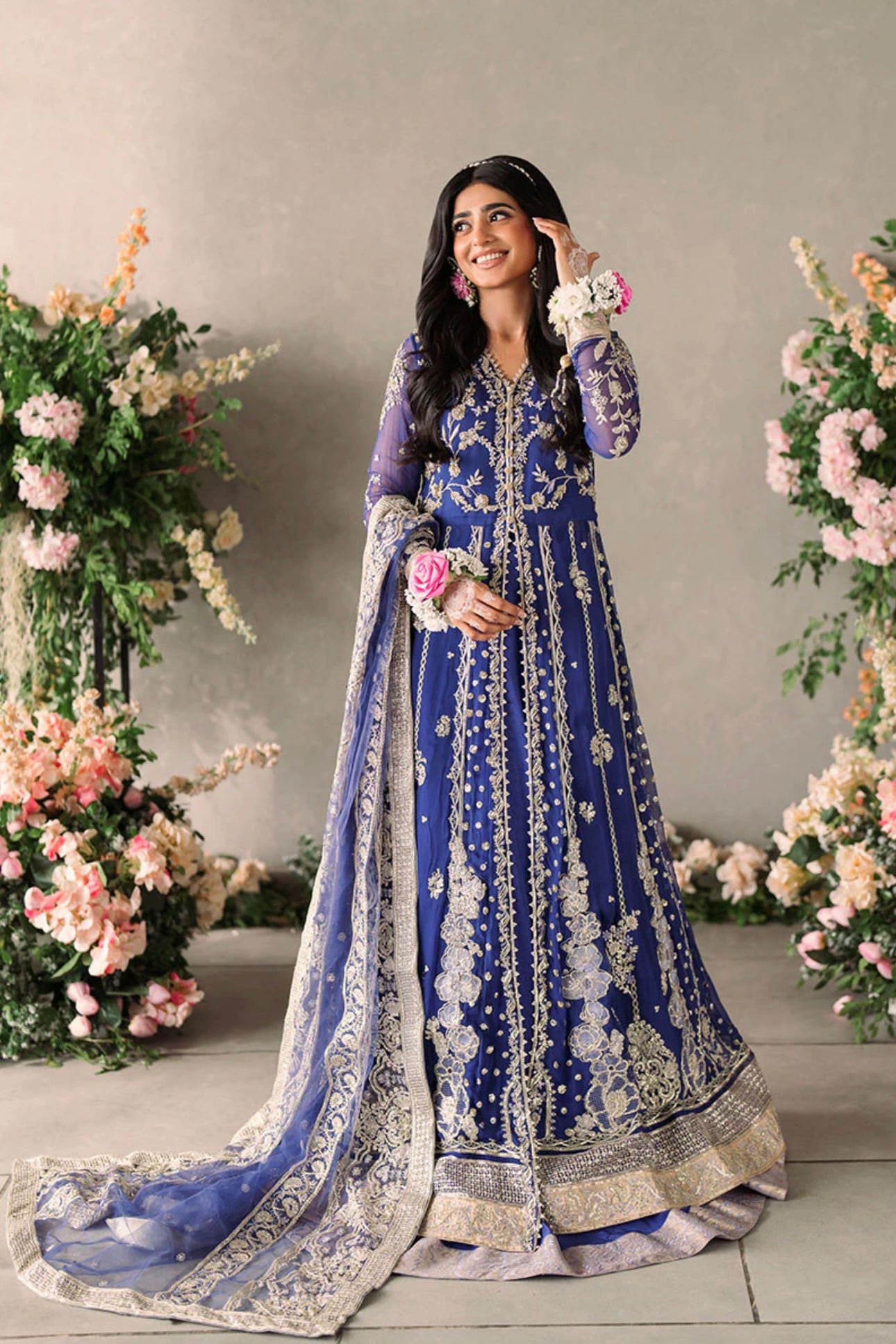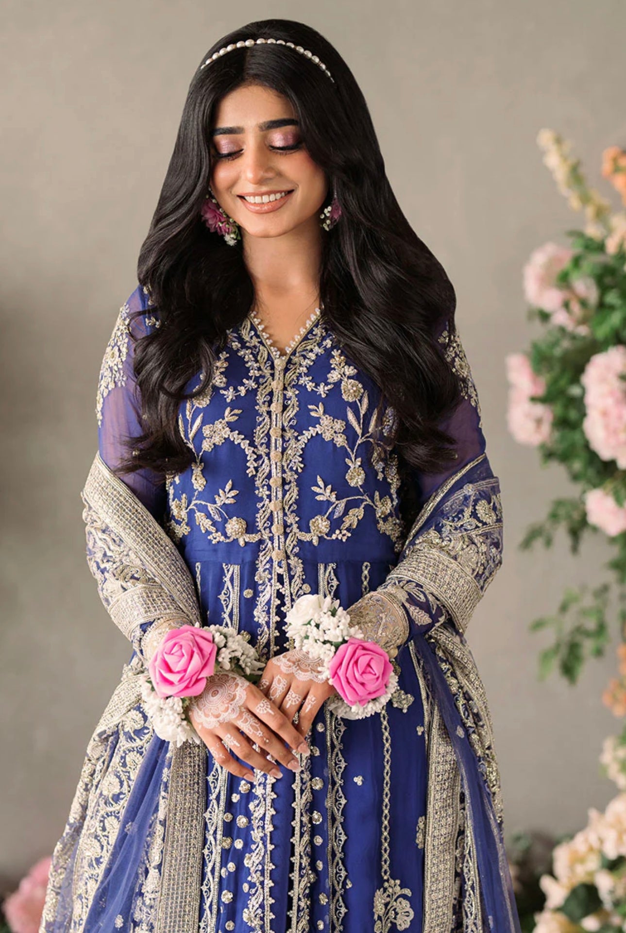 "Sehar" an exquisite creation in a captivating shade of blue. Crafted from luxurious chiffon, this hand-embellished ensemble features intricate detailing that adds a touch of opulence to its refined silhouette. The delicate embellishments shimmer and create a mesmerizing effect that's perfect for any special occasion. The look is complete with an embroidered and sequined net dupatta and silk trouser.