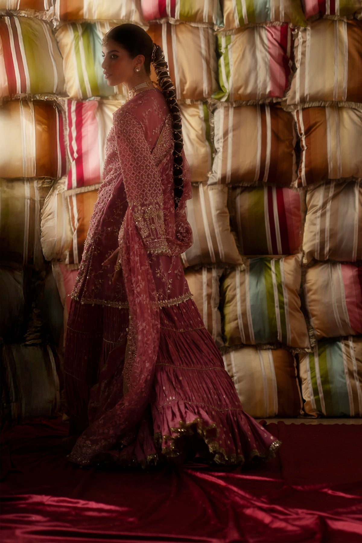 A dreamy candy pink short shirt adorned with intricate embroidery and delicate handwork, paired with elegant pleated gharara pants. The look is completed with a statement full heavy dupatta, creating the perfect blend of charm and sophistication.