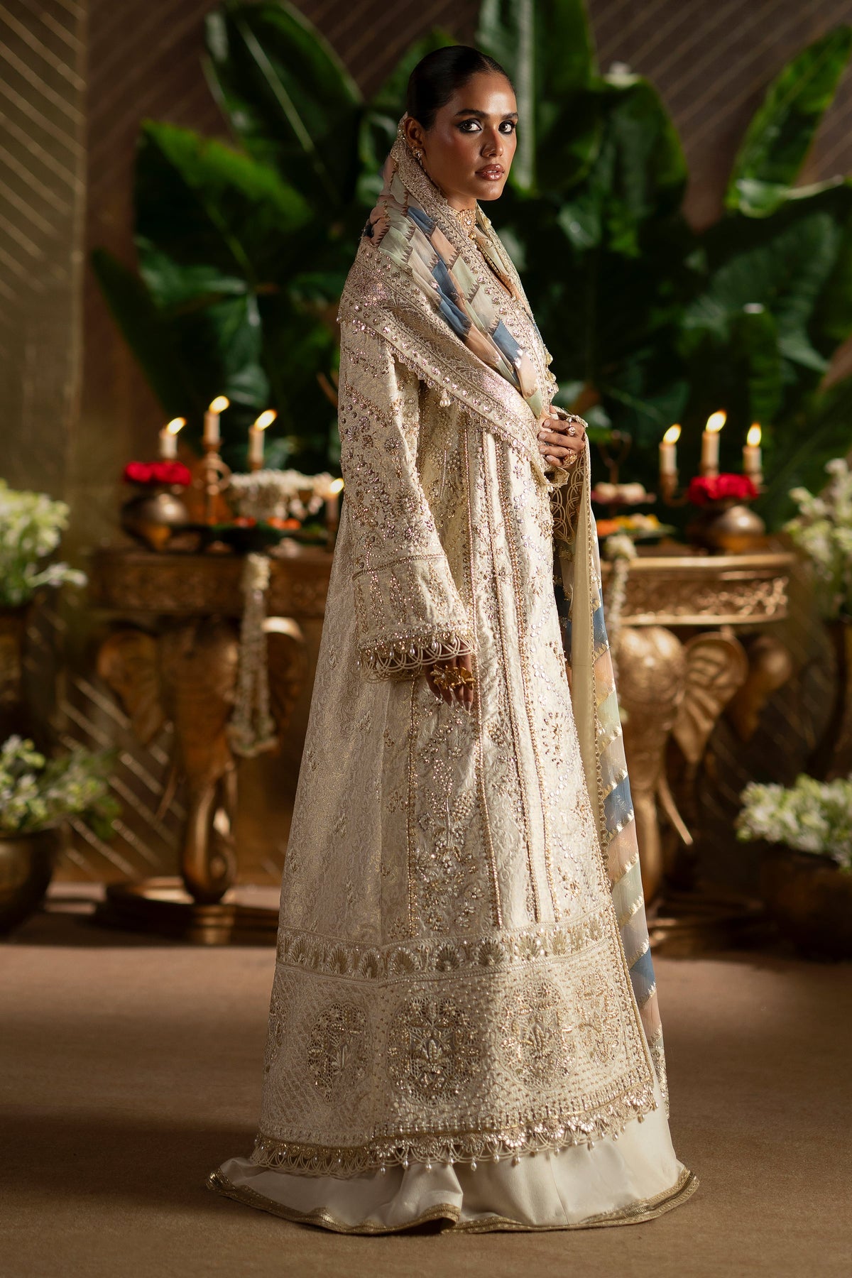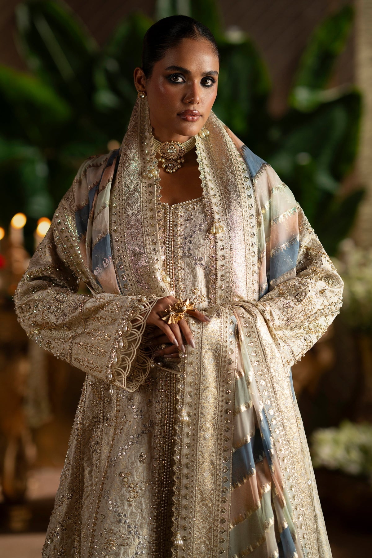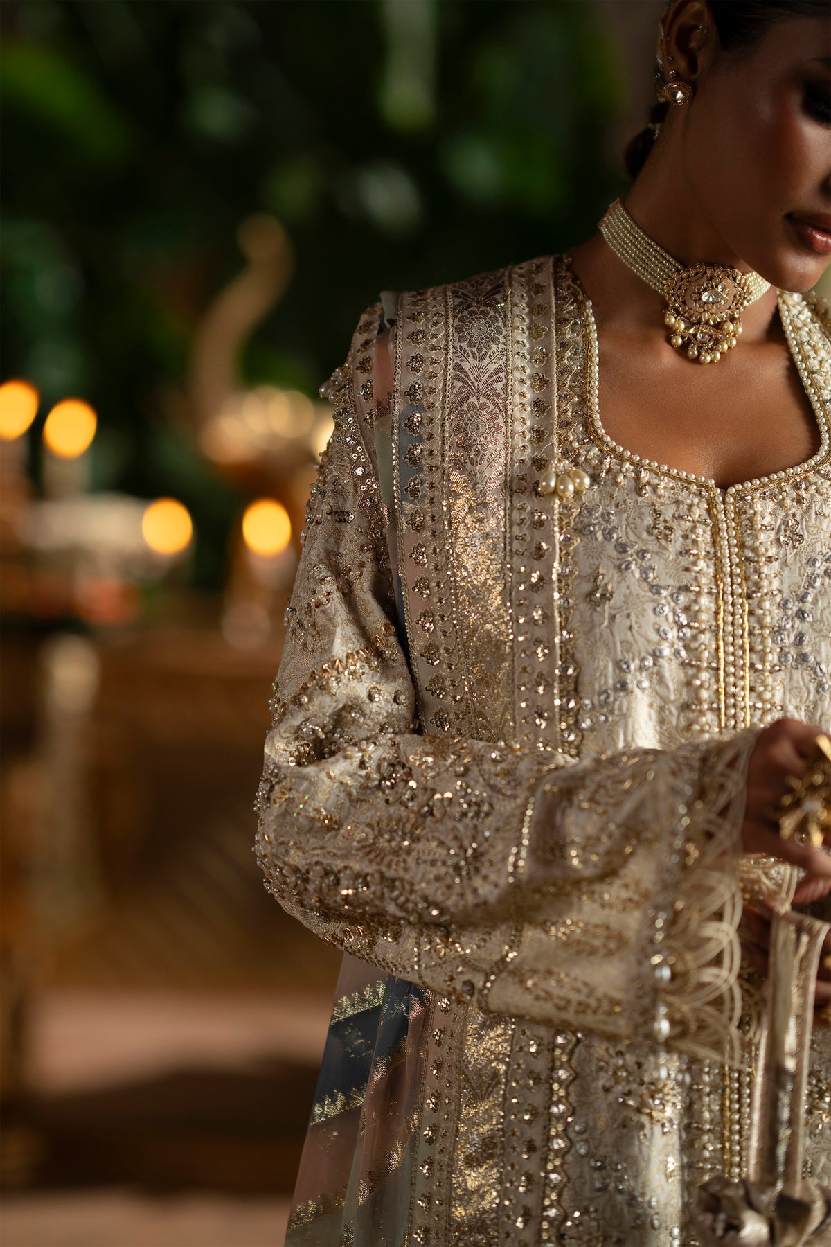 A timeless white and gold jamawar open kalidar, adorned with exquisite embroidery and delicate handwork. Paired with a hand-painted dupatta in classic chata paati style, this ensemble celebrates pure old-school elegance. The look is completed with traditional sharara pants, making it a perfect ode to heritage and grace.