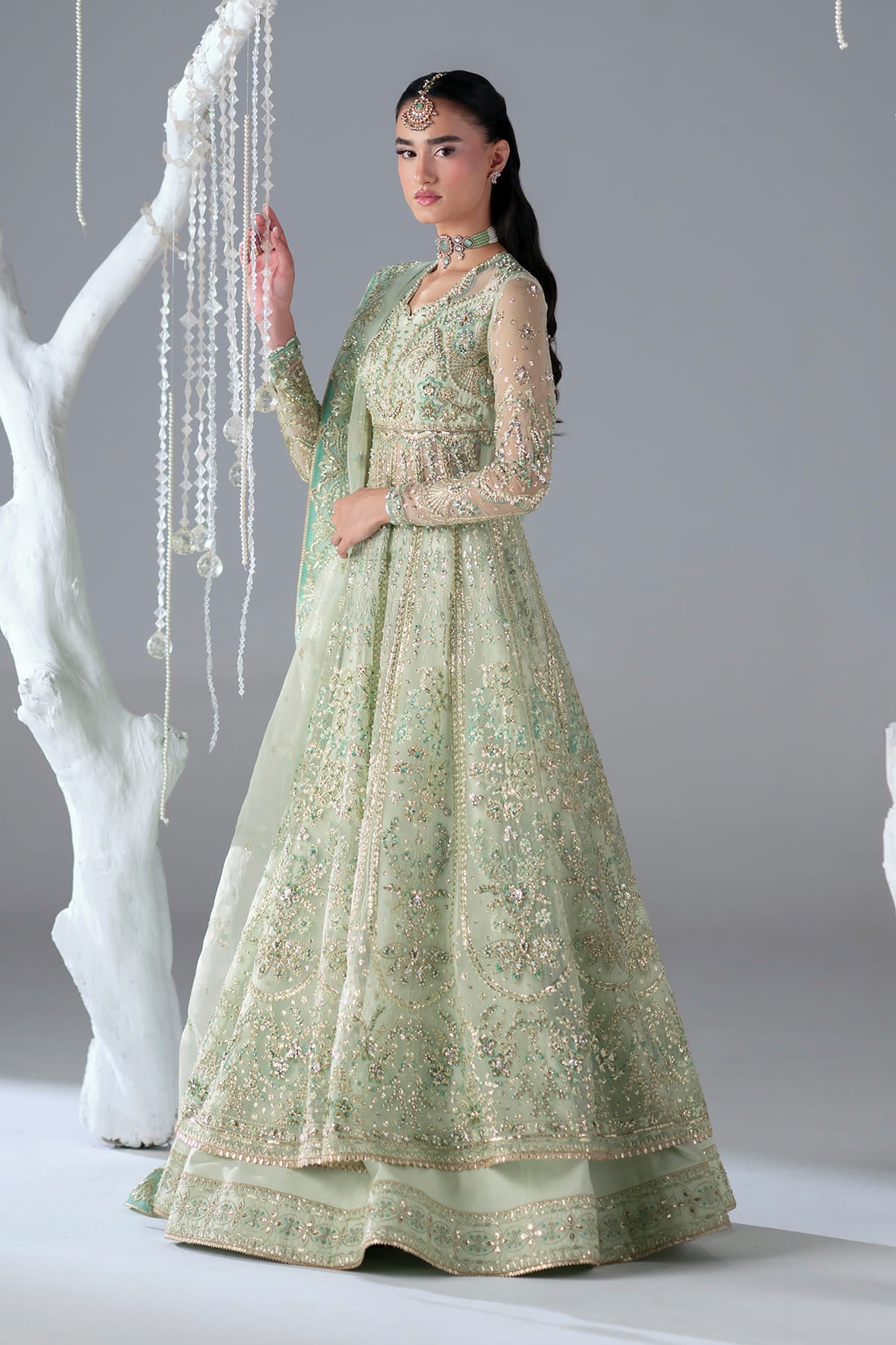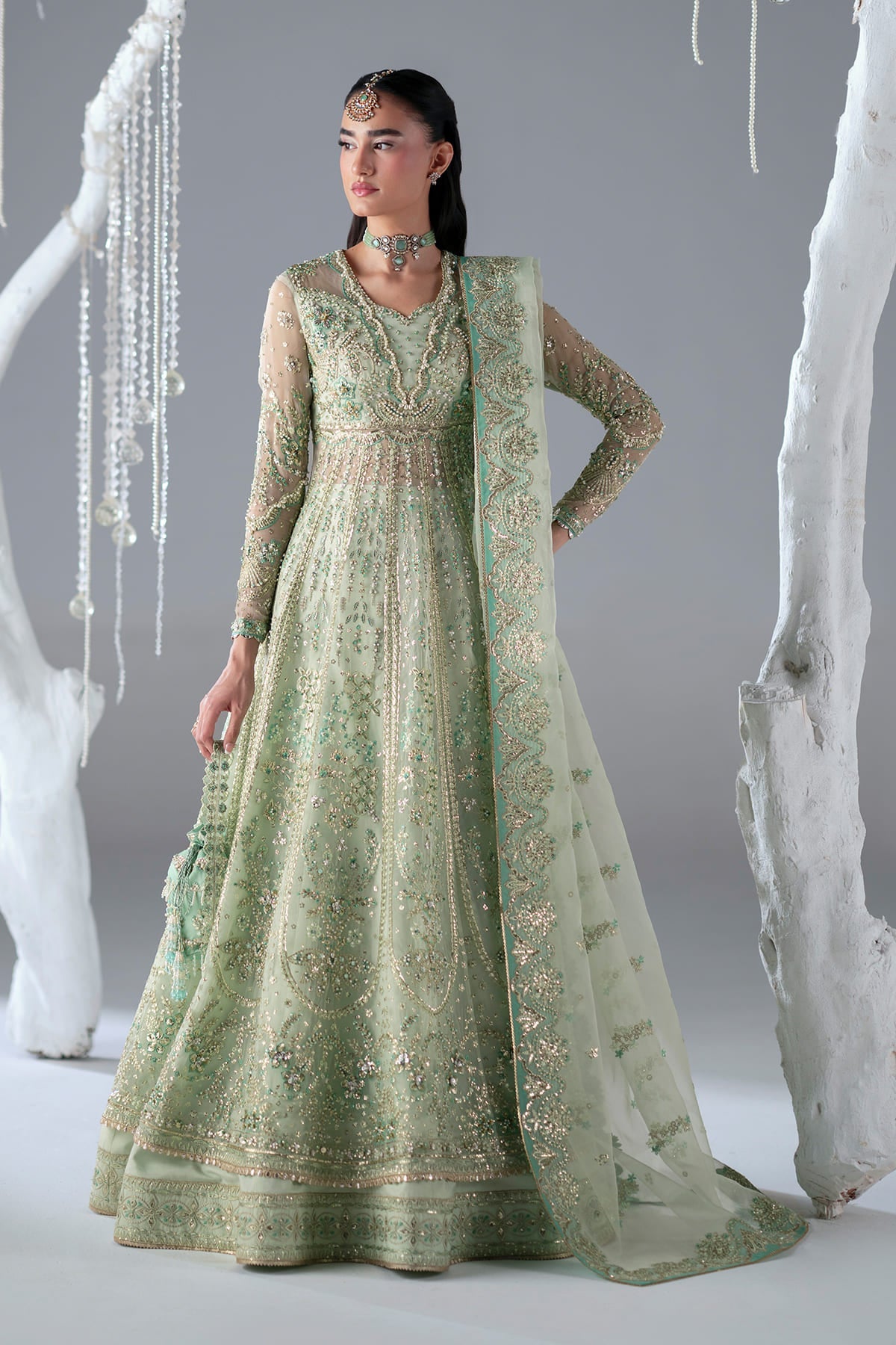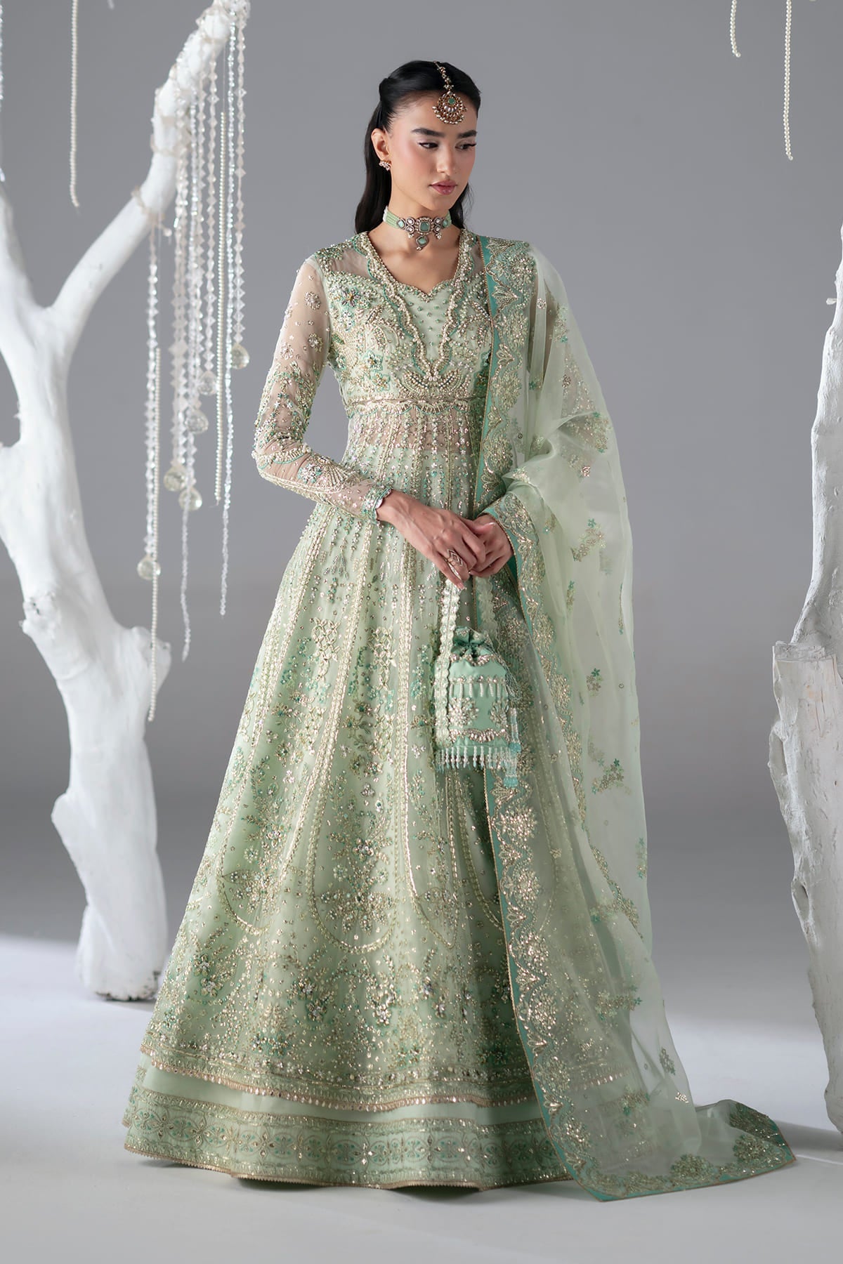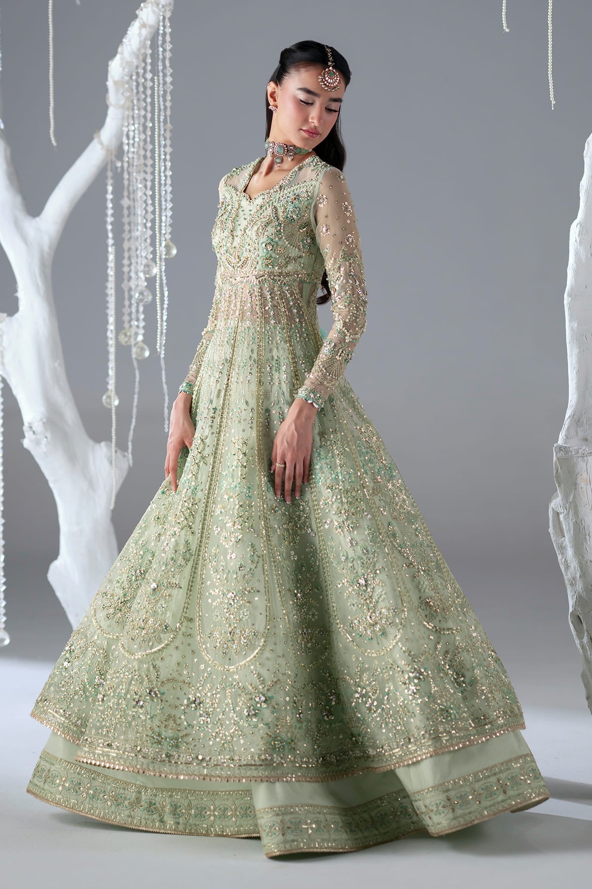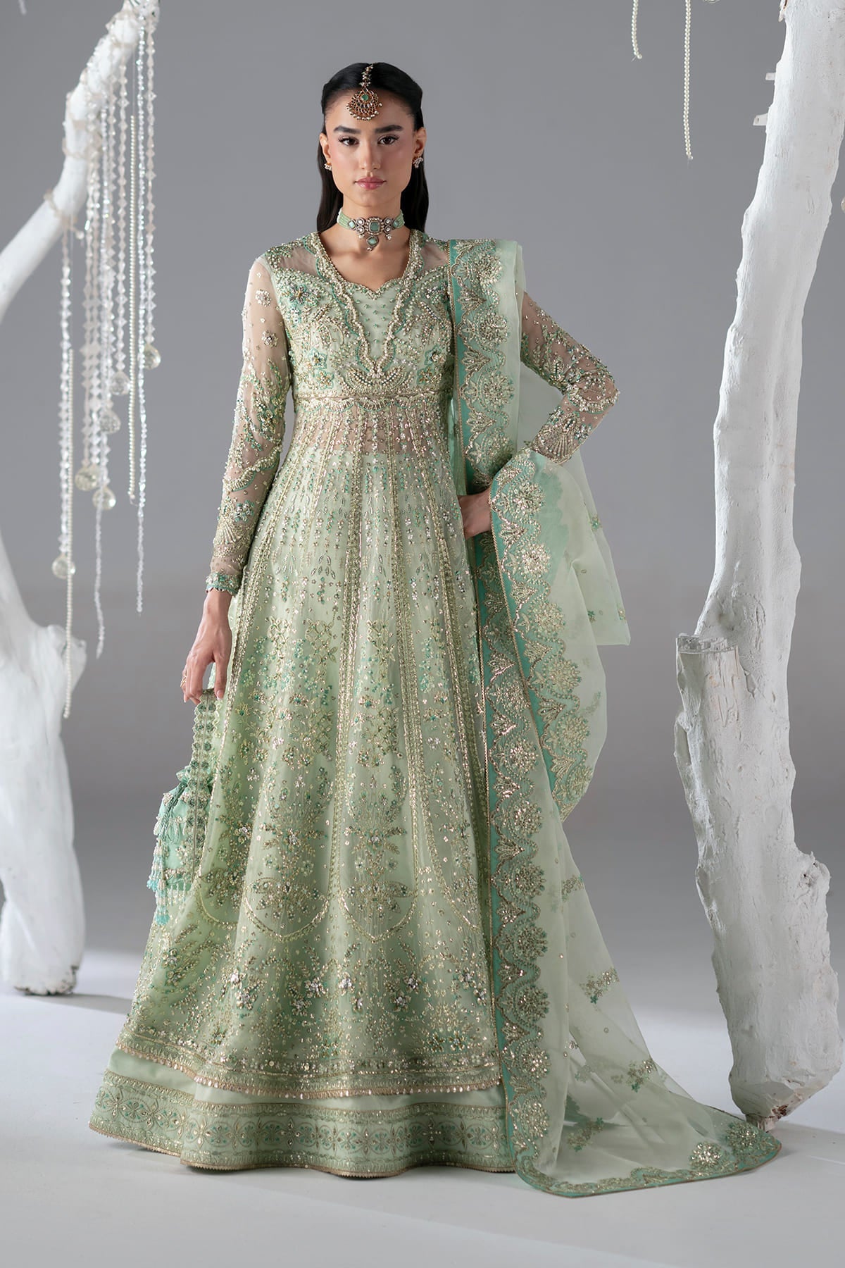 𝐒𝐭𝐞𝐥𝐥𝐚 — a mint green pishwas reverie in organza, where embroidery and embellishments of pearls, gotta, baithki, cut dana, and sequins shimmer with a gentle radiance.