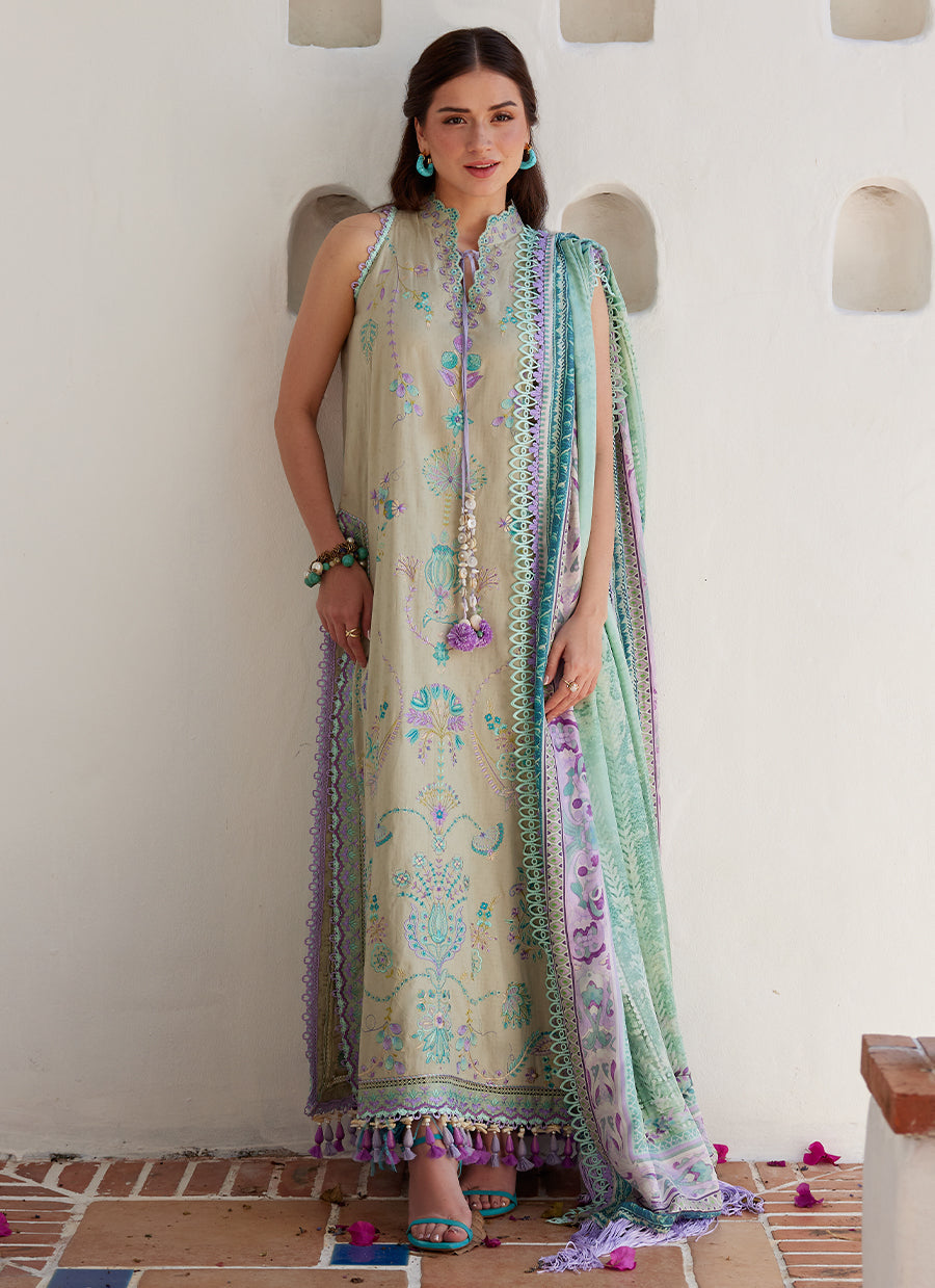 The look is completed with a beautifully printed dupatta in cool mint and lilac tones, framed with ornamental borders and soft fringe detailing — creating a fluid, ethereal finish.