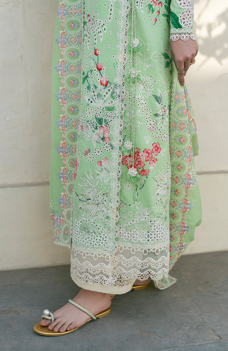 Fresh, fun, and made for festive vibes! This mint printed shirt is a summer dream, splashed with bold foliage patterns and breezy off-white borring infused pattern for a laid-back, beachy feel. A playful jaali neckline adds a touch of flair, while crisp cambric pants keep it effortlessly chic. Topping it all off? A floaty mint chiffon Georgette dupatta, kissed with soft peach and lilac hues—light, airy, and ready for all the twirls and thrills of summer season!