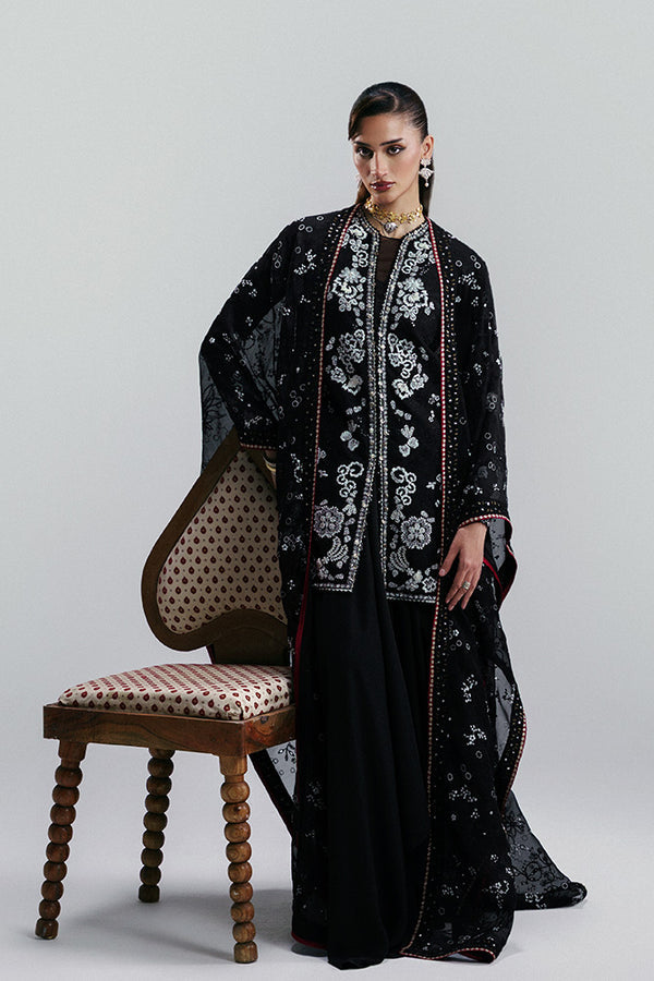 - Organza, jet black cape with black and white embroidery, lacework, sequin border, and a contrast red strip with gold motifs.