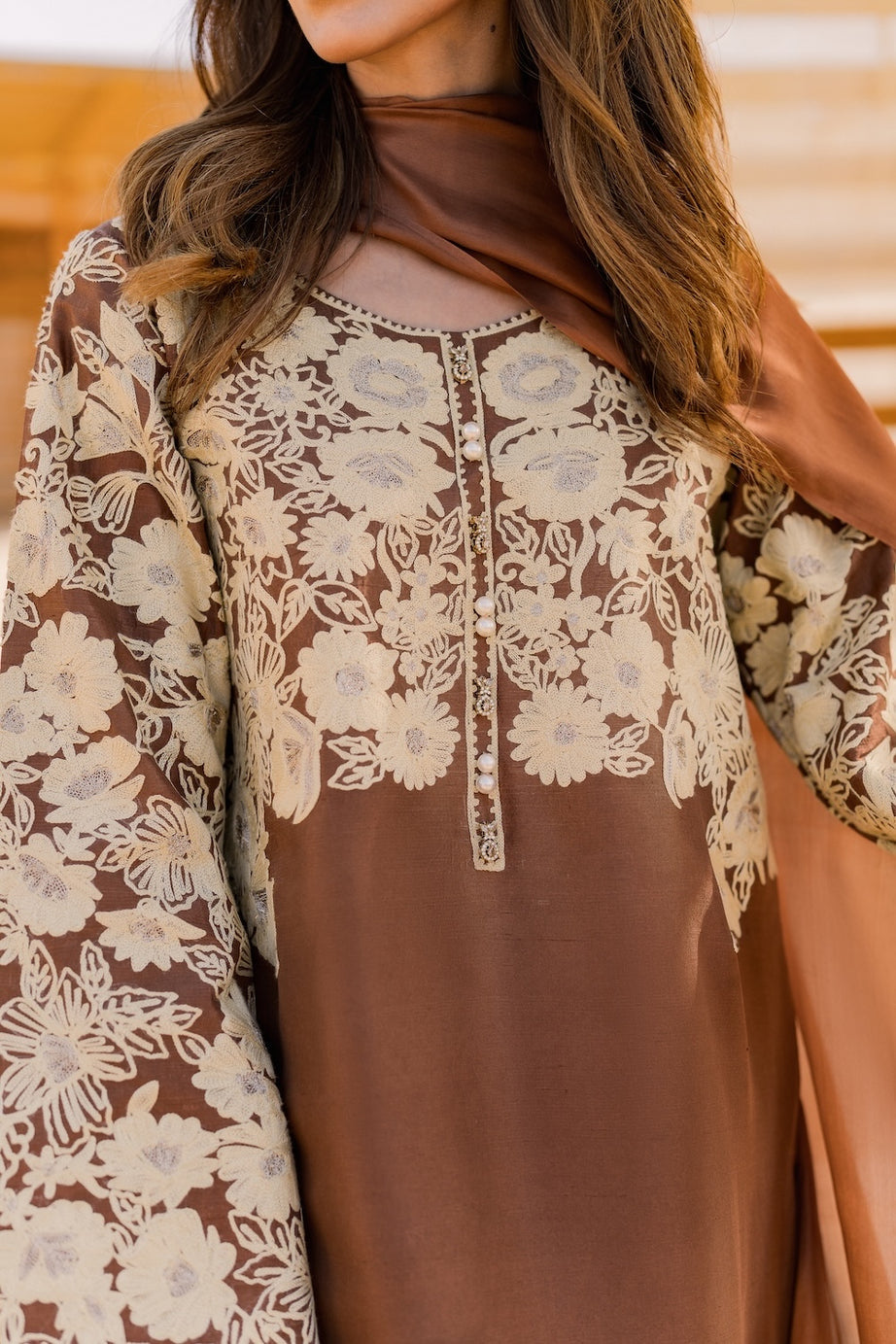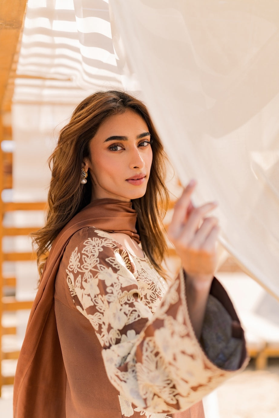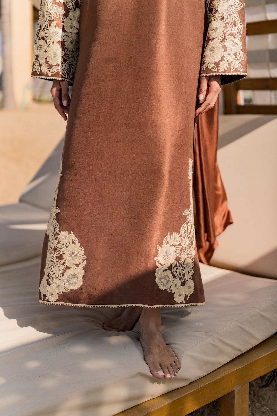 The shirt is fully adorned with intricate hand-done aari embroidery, showcasing exceptional craftsmanship.