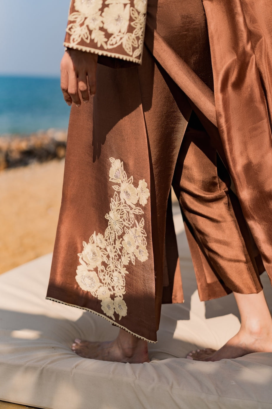 Paired with matching pants, the look remains cohesive and effortlessly graceful.