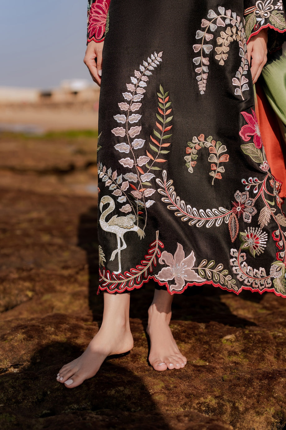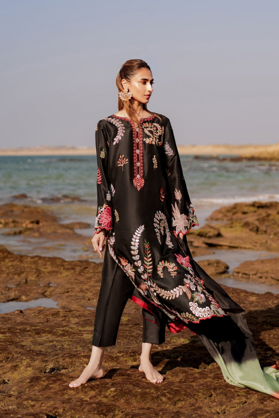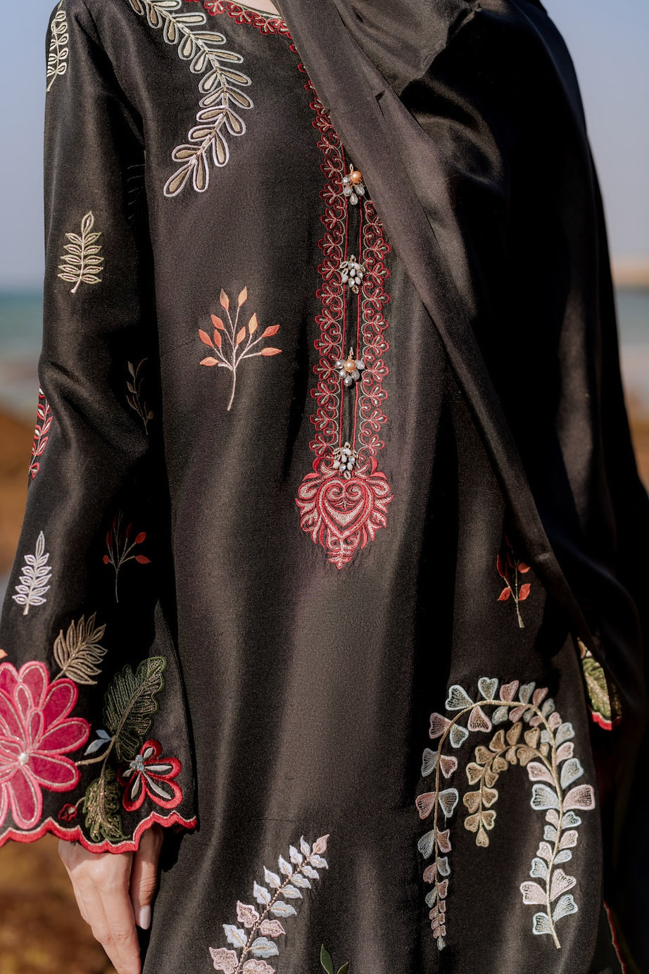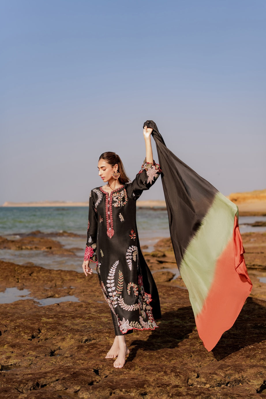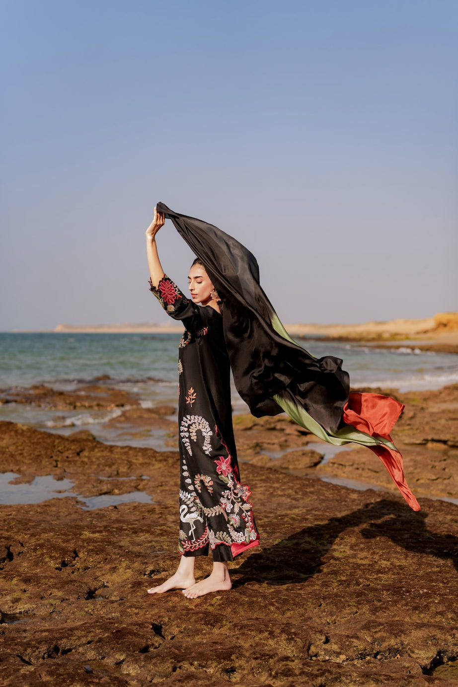 Make a striking statement this Eid with our black 2-piece ensemble, featuring a hand-embroidered shirt adorned with an elegant mix of floral and bird motifs. The intricate detailing stands out beautifully against the deep black base, adding a touch of artistic charm. Paired with sleek tapered pants, the silhouette is both modern and graceful. Elevate the look with an optional three-toned silk dupatta for a refined and festive finish.
